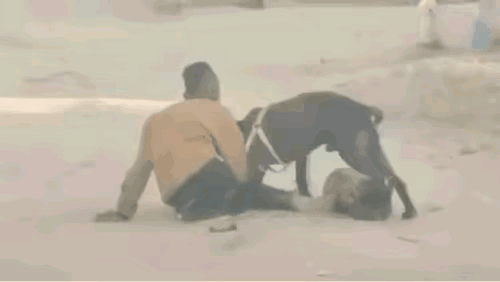 狗咬人时,怎么制服狗狗? 一个男子被一条大狗咬住腿,男子疼的受不了,怎么拽狗狗
