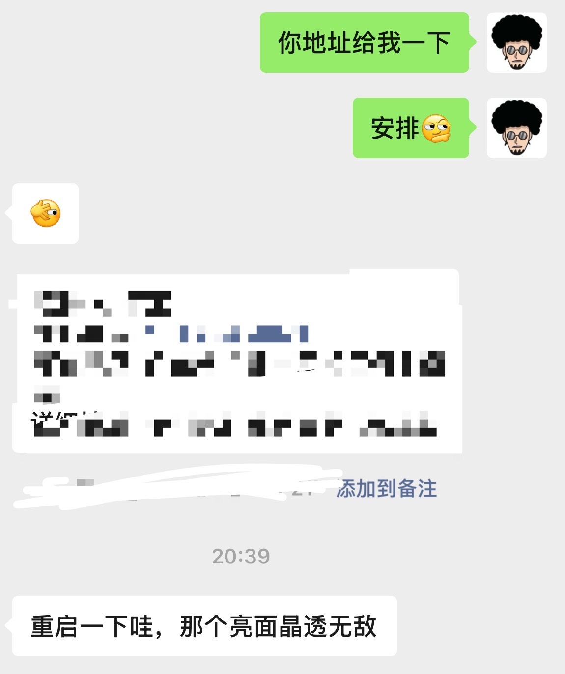 我跟他说了我们为什么不开亮面私模,跟他要了地址,给他发我们的磨砂 pp 给他感受一下[嘻嘻]