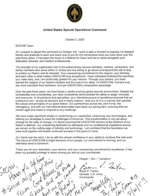 又一个跑路了!排长训话后,美陆军四星上将,美军特种作战司令部司令布莱恩·芬顿将军签署离职信,宣布不干了。芬顿上将出席了将军大会后,回来就交了退役信,说不是故意的,很难让人相信。他才60岁,比空军上将比西尔还年轻。离职前一天还参与了指挥部跑步活动。获得过杰出服役奖章、 优异服役勋章、 功绩勋章… 9月30日,国防部长赫格塞思在全球美军将领大会上撂下了狠话。赫格塞思对着满场将领公然宣称,不认同他观点的人可以离开,对他的话不满意的人能马上辞职。 紧接着,美国总统特朗普也跟着表态,谁想走可以走。这番话像颗炸雷,在美军高层炸开了锅。芬顿全程出席了这场大会,回来没多久就递交了退役信。 他的动作快得惊人。当地时间10月2日下午,芬顿正式宣布辞职。美军官方账号3日确认了这一消息,他将于当天正式交出指挥权。 芬顿的离职透着股蹊跷。他在辞职信里只字未提原因,只一个劲感谢同事和部下,还含糊其辞地说不是故意的。这种说法谁能信? 要知道,他才60岁,比前一天申请退役的空军上将托马斯·比西尔还年轻。更关键的是,离职前一天,他还精神抖擞地参与了指挥部的跑步活动,状态看着压根不像早有退意的样子。 这位上将可不是等闲之辈。他1987年就加入了美军,一路从基层干到高层。他当过国防部长高级军事助理,做过印太司令部副司令,履历上堆满了硬荣誉。 杰出服役奖章、优异服役勋章、功绩勋章……这些沉甸甸的勋章,都是他在军中摸爬滚打几十年的证明。这样一位身经百战的老将,怎么会突然在一场训话后就撂挑子? 答案恐怕藏在美军这大半年的动荡里。今年2月,美军最高指挥层就经历过一轮“大清洗”,前参谋长联席会议主席布朗上将等人都被撤换。 4月份更热闹,国防部多名高官因为“群聊泄密”调查和内部矛盾被解雇,连防长幕僚长都换了人。当时就有官员警告,五角大楼已完全崩溃,没人的职位是安全的。 赫格塞思早就放出过风声,要把四星军官人数削减20%,国民警卫队将官人数砍得更多。他的理由听着冠冕堂皇,说将军数量多带不来成功。 明眼人都清楚,这是特朗普在给美军“大换血”。特朗普跟军方的梁子早结下了,第一任期就因为撤军问题跟多位将领闹掰,连参谋长联席会议前主席米利都被他骂成“叛国贼”。 如今特朗普重新上台,要推动战略收缩、平衡利益集团,自然要清除军中“不听话”的人。赫格塞思的训话,更像是给这些老将下的“逐客令”。 芬顿显然不是唯一的“牺牲品”。就在他辞职前一天,空军上将比西尔已经先一步申请退役。两人一前一后的动作,把高层对当前领导层的不满摆上了台面。 有人说芬顿早有卸任计划,但这种说法根本站不住脚。特种作战司令部是美军的核心部门,负责全球范围内的战略任务,这种岗位的交接不可能如此仓促。 更耐人寻味的是,五角大楼对离职原因讳莫如深。官方只敢确认消息,却对背后的纠葛避而不谈,这反倒让猜测越来越多。 五位前国防部长都看不下去了,联名写信谴责特朗普解雇高级军官的行为。他们在信里直言,特朗普在把军队变成党派政治的工具,正在削弱美国的国家安全。 可这些谴责没起任何作用。芬顿的离职信一签,美军高层的“离职潮”还在继续。这已经不是简单的人事变动,而是一场自上而下的权力洗牌。 芬顿带着一身勋章离开,留下的是更混乱的五角大楼。那些曾经跟着他出生入死的部下,看着空荡荡的司令办公室,心里难免打鼓。 一位在军中服役二十年的老兵在社交平台吐槽,从没见过这么折腾的高层,再这么闹下去,军队的士气都要被磨光了。 这话不算夸张。从布朗到比西尔,再到芬顿,被换掉的都是有实战经验的老将。取而代之的,是更贴合特朗普政策、更亲近新兴科技集团的人选。 特朗普想让美军更忠诚、更注重科技、对战争更小心,可他忘了,军队的根基是军心。芬顿的突然离职,就是军心浮动的最直接信号。 这位60岁的四星上将,用自己的退场给美军敲了警钟。可在这场自上而下的清洗里,这记警钟能被听进去吗?恐怕很难。 信源:环球网国际频道《又一个!美军四星上将宣布辞职》