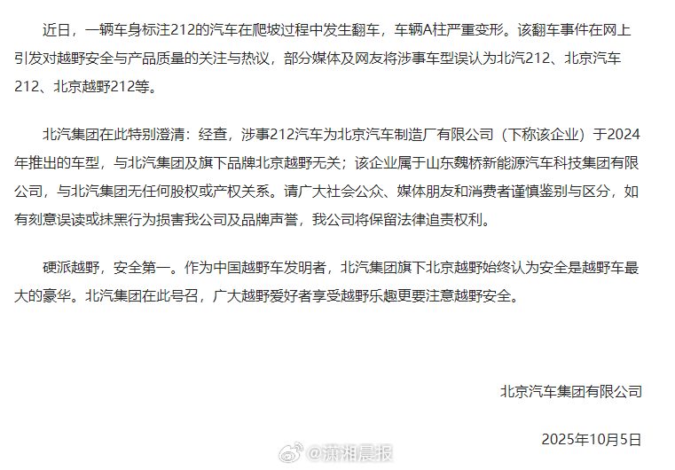 #北汽集团回应212汽车爬坡翻车#【#北汽集团发布声明#:212汽车爬坡翻车车辆与北汽集团品牌越野无关】10月5日,北京汽车集团有限公司发布澄清声明:近日,一辆车身标注212的汽车在爬坡过程中发生翻车,车辆A柱严重变形。该翻车事件在网上引发对越野安全与产品质量的关注与热议,部分媒体及网友将涉事车型误认为北汽212、北京汽车212、北京越野212等。