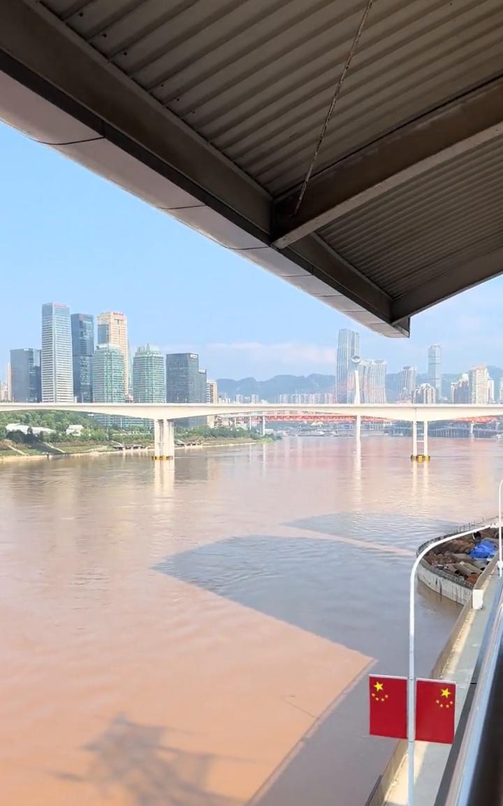 今天嘉陵江的水是黄的,特别的黄。这个手机拍不出它的黄,但还有人在游泳。你们看,真的好疯狂。十月六号给大家看一下,今天水位还是很高,洪崖洞江滩还是被淹没。这是黄花园地铁站,大西沟地铁站。