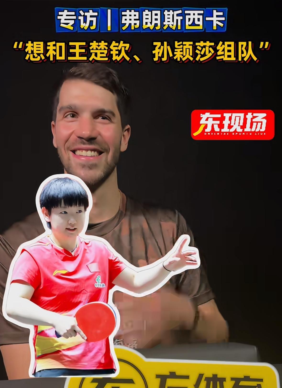 弗朗西斯卡最想和孙颖莎 王楚钦搭档双打——这是夺金牌的最好机会 弗朗西斯卡说, 如果有机会和国乒选手合作的话, 男双搭档会选择王楚钦, 因为他是一名左手运动员, 混双搭档他会选择孙颖莎, 这也许就是夺冠的最好机会! 弗朗西斯卡说, 他以前和王楚钦搭档过, 感觉非常棒, 弗朗西斯卡的情商很高, 在WTT的比赛中, 会选择王楚钦, 因为他现在是在打WTT的比赛! 排队吧, 外协基本都是选择孙颖莎 王楚钦 做双打搭档!