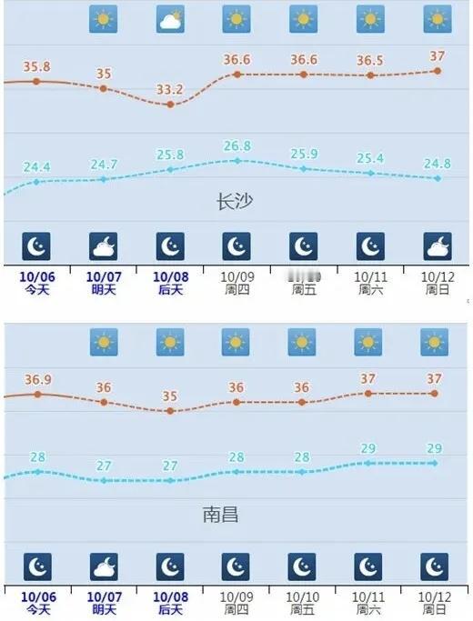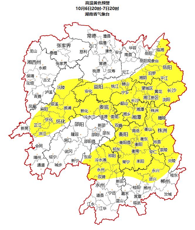 今年国庆中秋假期,湖南天气与常年10月上中旬“变凉”规律显著不同。受异常偏强的副热带高压影响,南方暑热顽固,湖南等江南、华南多地将迎4至7天持续高温,部分地区最高温可达38℃左右,长沙等大城市已打破当地最晚高温日纪录,且纪录还将继续刷新。 湖南省气象台10月6日16时发布高温黄色预警,预计7日白天长沙、株洲、湘潭等10市将现35℃以上高温,局部达37℃以上。具体预报显示,6日晚至9日白天全省以晴天间多云为主,湘南、湘西北局地有阵雨,清晨湘中、湘北局地有雾;最高温多在30℃-37℃间,最低温21℃-25℃。即便已入10月,大家仍需注意防暑降温。