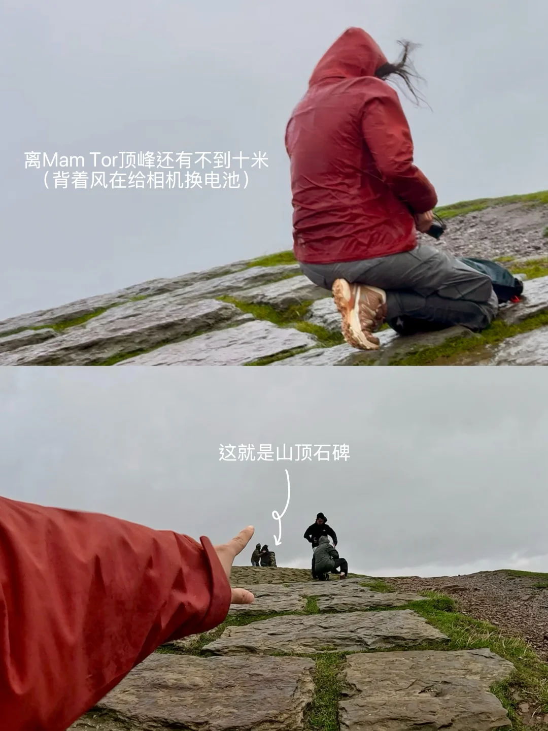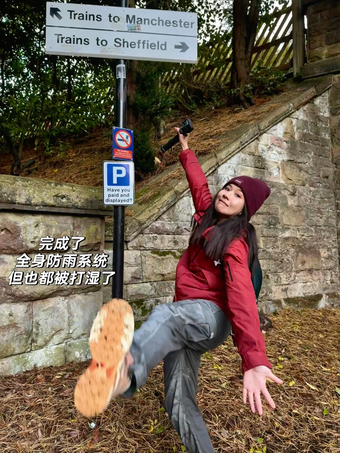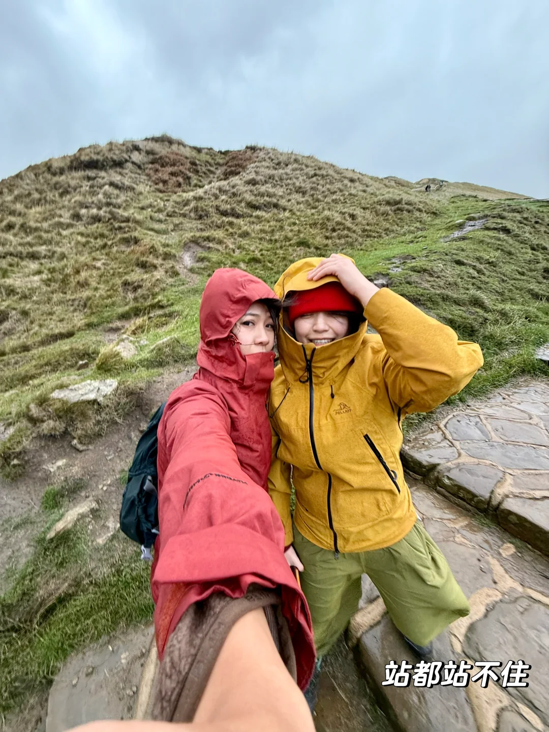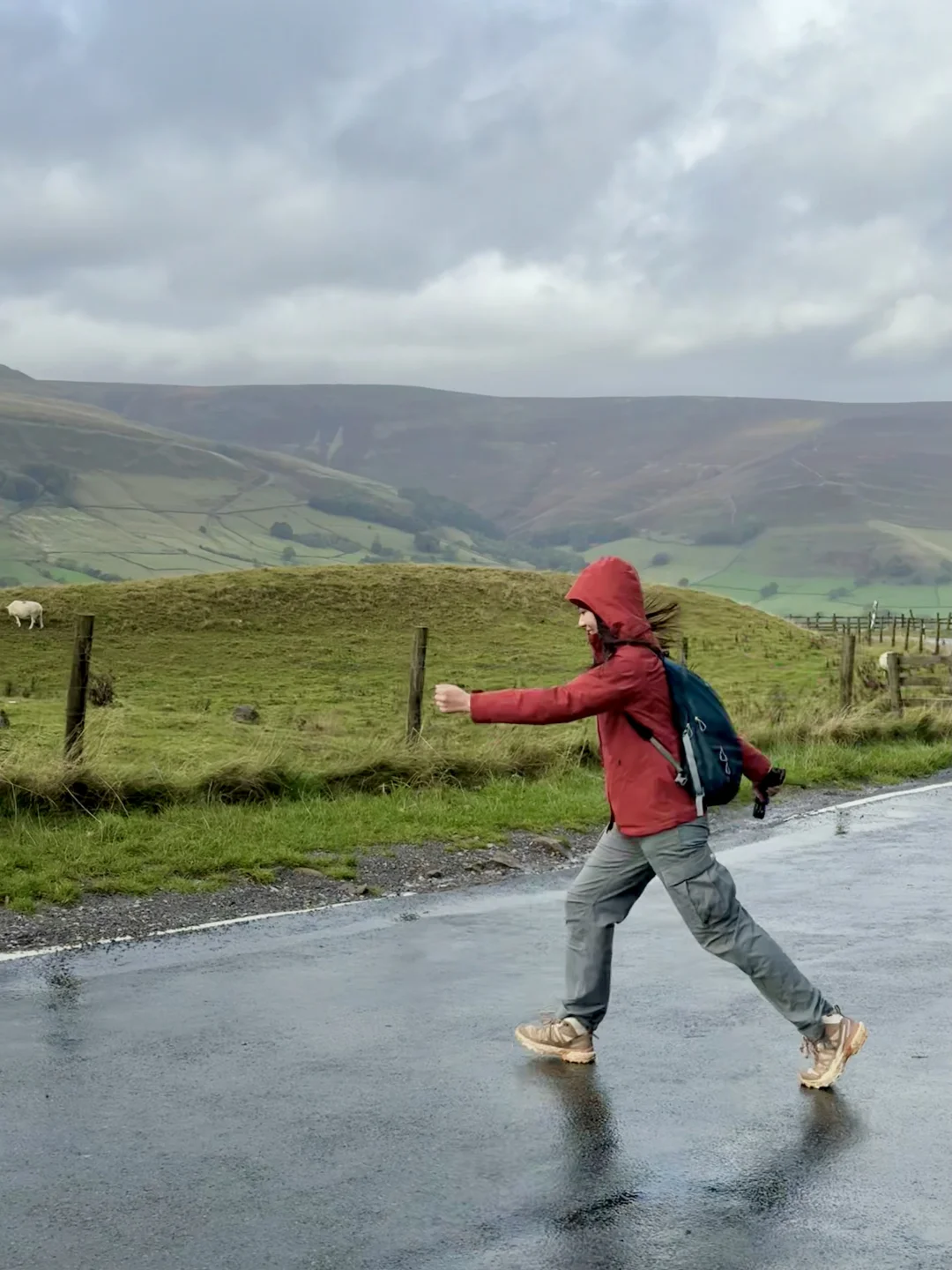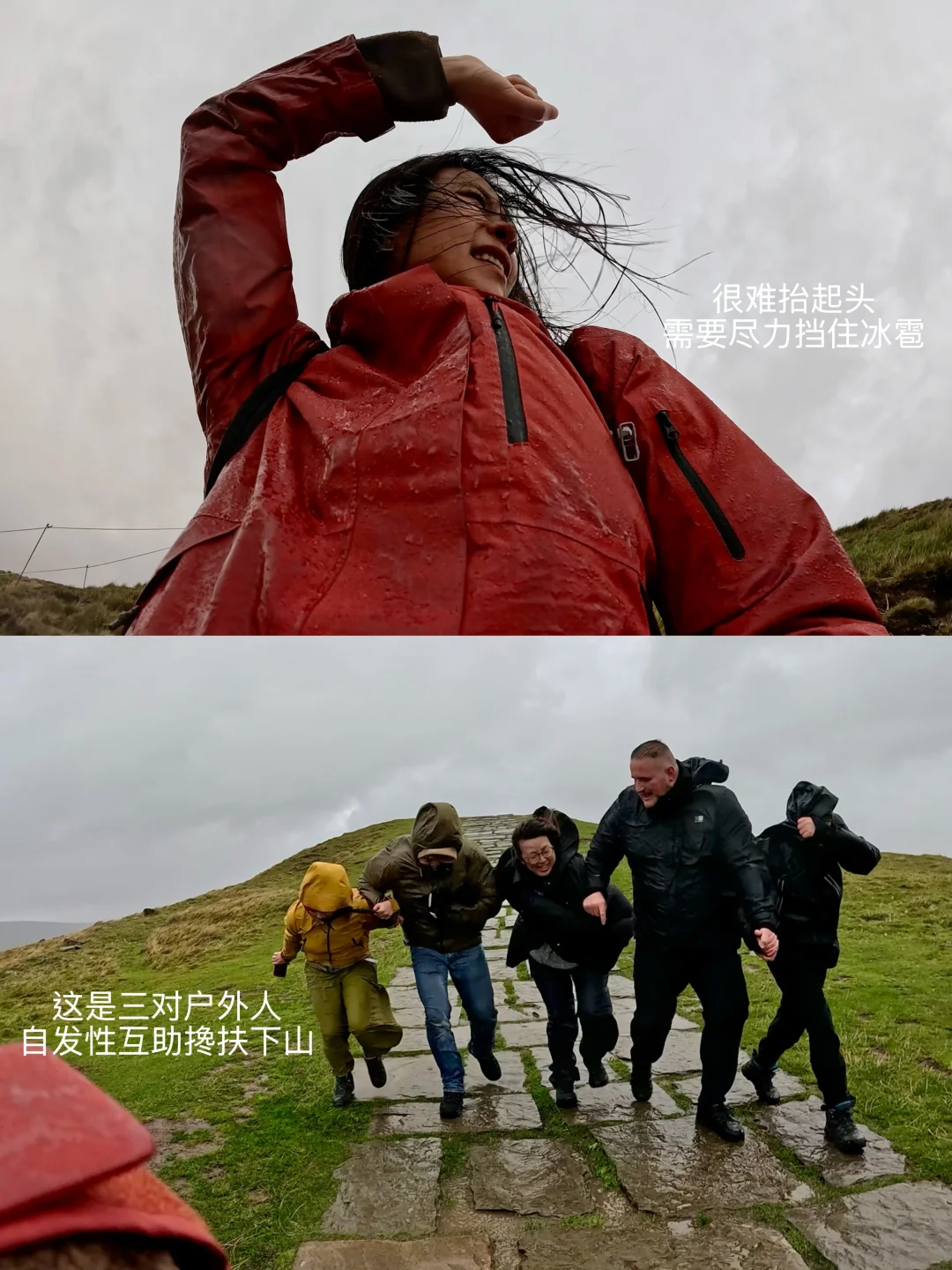 这次遇上storm——在苏格兰训练过那么些时日,想着可以不停留打卡,只要快速通过就行!结果没想到是那么狠的天气:风速49km/h,好几次差点被吹跑;最主要是冰雹乱飞,脸都被砸麻了。眼看山顶石碑就在几米外,却完全站不稳,所有人都蹲着“爬”下山,我也果断折返。下山后沿公路 hitchhike(👍),被好心人载回 Edale 🚗(伦敦小哥太友好了!)