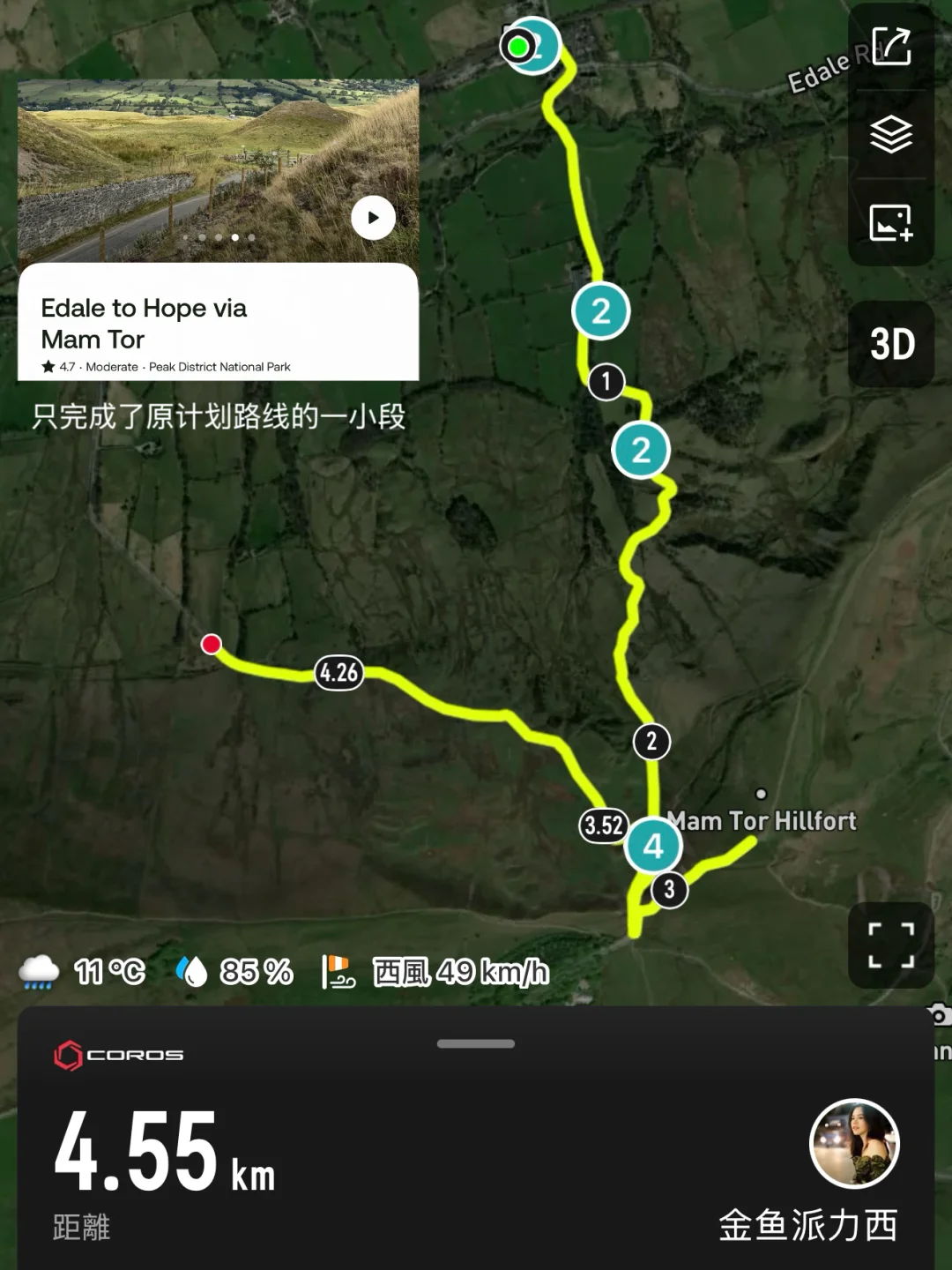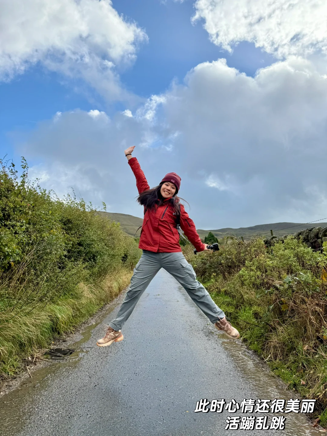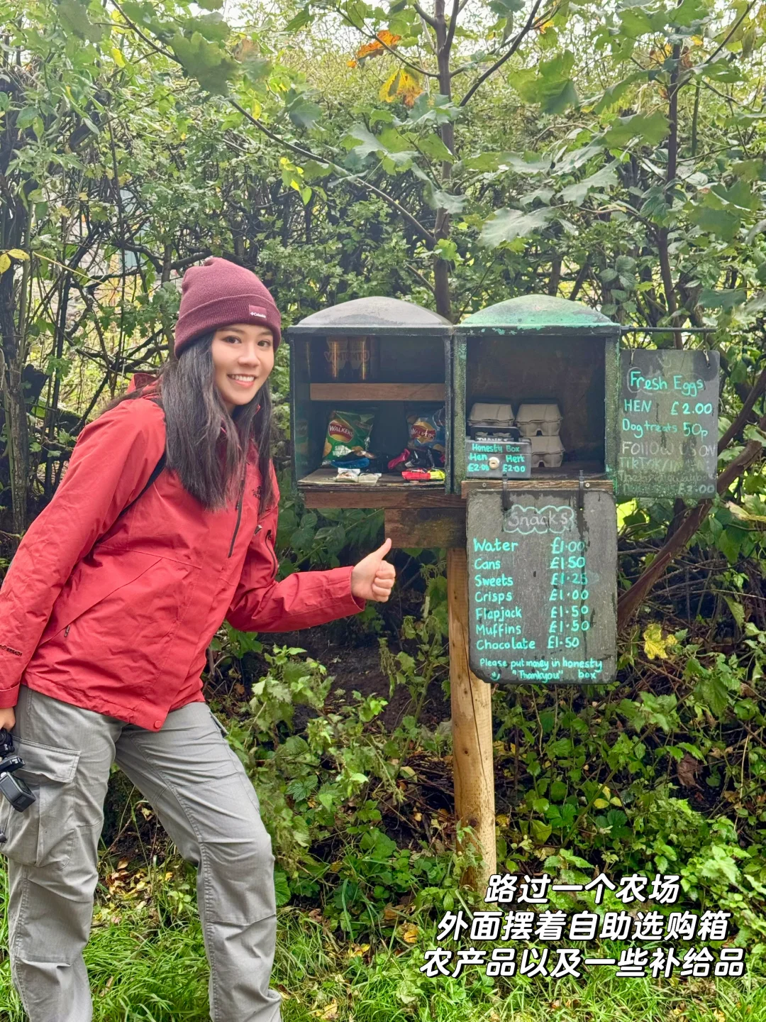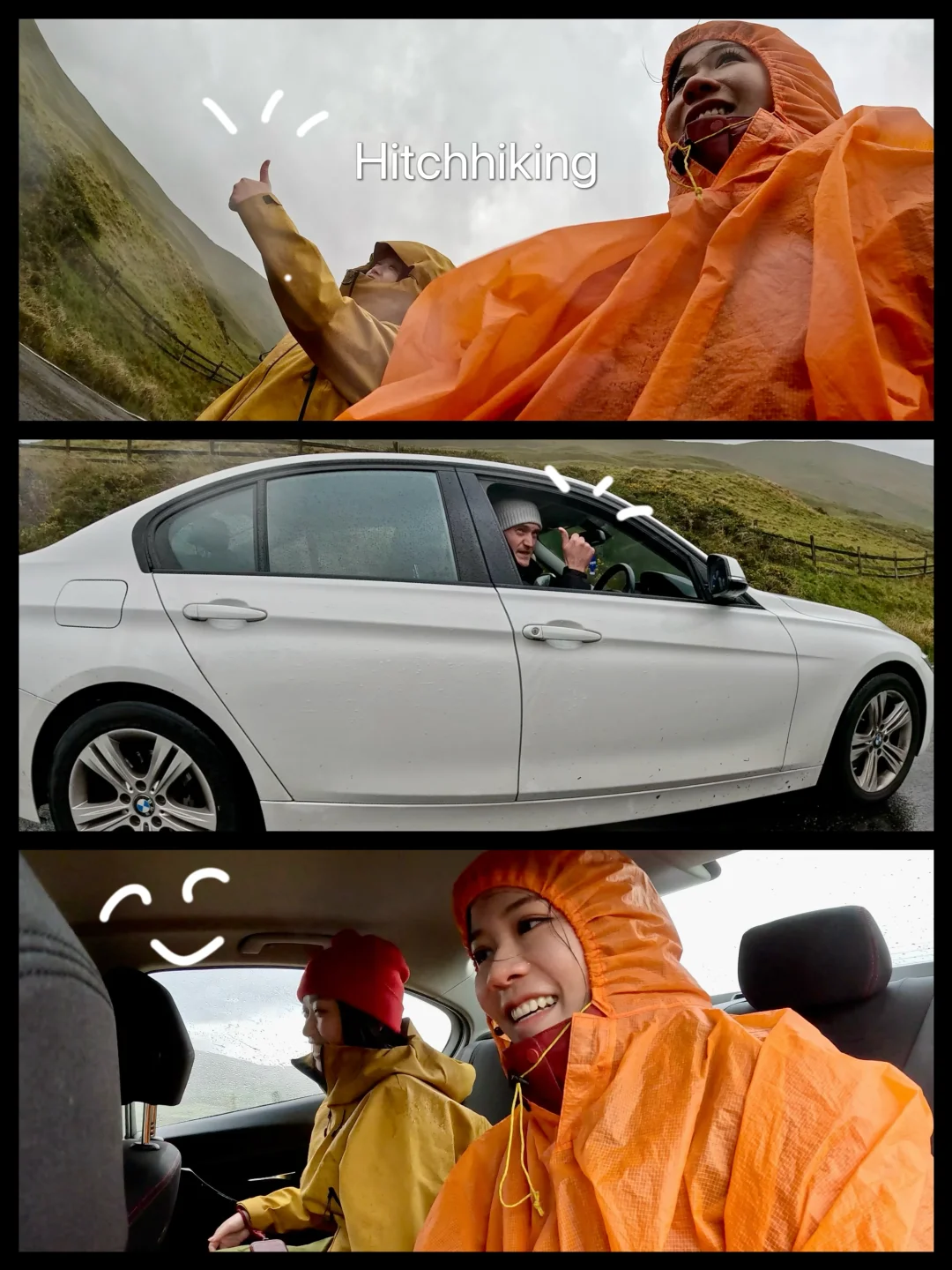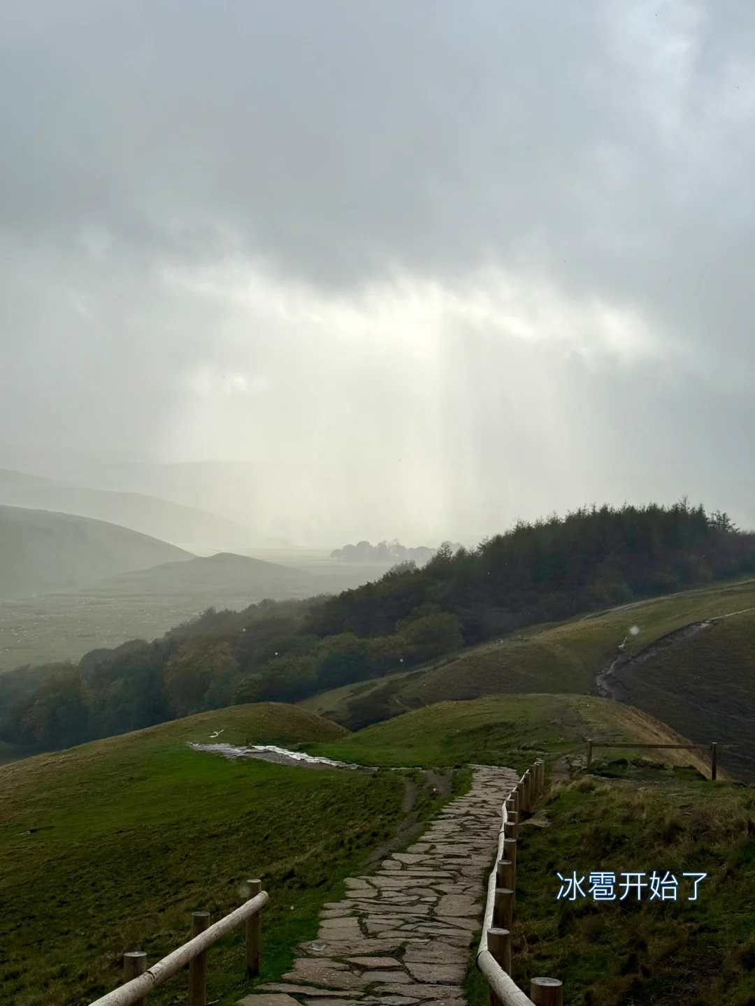 这次遇上storm——在苏格兰训练过那么些时日,想着可以不停留打卡,只要快速通过就行!结果没想到是那么狠的天气:风速49km/h,好几次差点被吹跑;最主要是冰雹乱飞,脸都被砸麻了。眼看山顶石碑就在几米外,却完全站不稳,所有人都蹲着“爬”下山,我也果断折返。下山后沿公路 hitchhike(👍),被好心人载回 Edale 🚗(伦敦小哥太友好了!)
