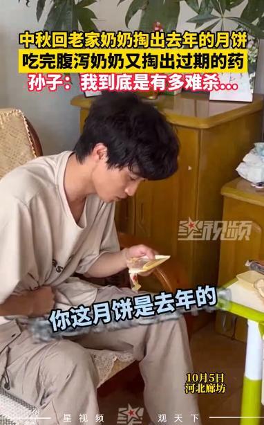 “防不胜防!”10月5日,河北廊坊,一小伙趁着中秋回老家看望奶奶,老人特地拿出月饼给孙子吃,谁知吃完了之后孙子腹痛难忍,看了一眼包装才发现竟然是去年的月饼,随后奶奶又拿出药给孙子,结果这些药竟然也是过期的!网友:这孙子可真“难杀”啊。 其实像这种奶奶每个人家里或许都有一个,只不过他们舍不得扔的东西可能是其他各种各样的物品,说到底还是老人们节约惯了,即便是过期了的东西也不愿意扔! 据这位小伙所说,他当天是中秋节的时候回去看奶奶,顺便和老人一起吃饭的,可奶奶怕他肚子饿了,就找出了一个月饼给孙子吃。 小伙想都没想就把月饼拆开吃掉了,没想到吃完了之后没过多久,肚子却开始越来越痛,还频繁的上厕所,他看了一眼月饼上的包装之后,才发现这个月饼原来竟是去年的月饼,早已经过期了。 孙子哭笑不得的把这个消息告诉奶奶,没想到奶奶又拿出了几盒药,打算让孙子吃了药之后好受一点,这次孙子学聪明了,先看了一眼保质期,结果发现这些药竟然也已经过期了! 这下他是真的有些傻眼了,自己这还是“亲奶奶”吗,怎么一直把过期的东西给他吃,这要是不把身体吃出毛病来才怪了。 不过这也是可以理解的,毕竟老人们都不舍得把花钱买的东西扔掉,事后小伙又仔细检查了奶奶家里的药,把过期的都扔掉了,毕竟老人如果不知道误食了的话,那后果可能反而更严重! 信息来源:《小伙中秋节回老家,误吃过期月饼腹泻后,奶奶又拿出了过期的药》星视频