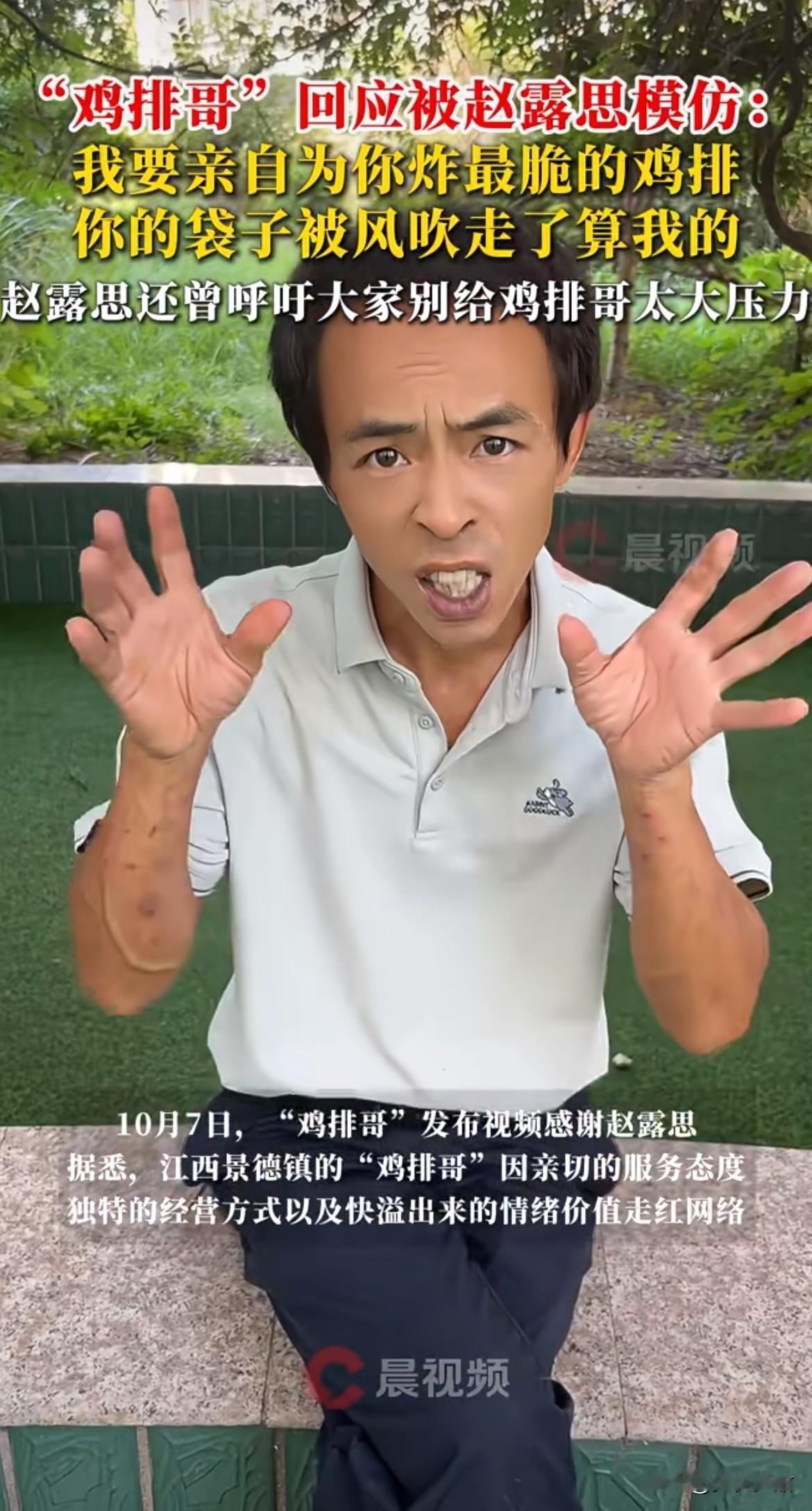 赵露思多次模仿鸡排哥 公开夸鸡排哥很有管理能力,自己很喜欢。 双向奔赴真有意义,鸡排哥回应她:要亲自为赵露思炸最脆的鸡排,如果说她的袋子被风吹走了,算鸡排哥的。 赵露思在直播中多次即兴发挥,模仿鸡排哥的招牌动作和经典语录。她嘴里说着“做完你的做你的,做完你的做你的”,还配上鸡排哥的经典手势,真的是要多可爱就有多可爱。在直播中,她还多次夸鸡排哥很优秀,具有很强的管理能力,她分享自己在鸡排哥身上学到了很多,“无论从事哪个职业,对工作充满了热情”。呼吁大家不要给鸡排哥太大的压力。 鸡排哥发视频感谢赵露思的喜欢,也感谢她对自己那么高的评价。他没想到那么大一个明星,竟然会关注到自己这么一个普通人。他也没想到,自己这种巷口小摊的碎碎念能让赵露思记住那么多的细节。他表示很真诚的欢迎赵露思能来江西景德镇,在鸡排哥的小摊前坐一坐。他还要亲自为赵露思炸最脆的鸡排,还说了如果赵露思的袋子被风吹走了,算鸡排哥的。 鸡排哥公开表态,自己会守护好自己的小摊,服务好自己的每个顾客。 两个都是很好的,都在相互成就。这样的人怎么能不让人喜欢呢。鸡排哥