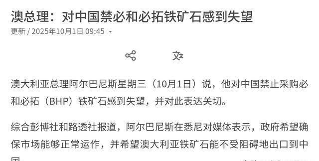 澳大利亚急了!在我们下达暂停购买必和必拓(BHP)铁矿石之后,澳大利亚出来回应了!10月1日,澳大利亚总理阿尔巴尼斯表示,他对中国禁止采购必和必拓(BHP)铁矿石感到失望,并对此表达关切。政府希望确保市场能够正常运作,并希望澳大利亚铁矿石能不受阻碍地出口到中国。 话说回来,铁矿石对澳洲来说,就是命根子。澳洲出口里,这东西占大头,中国买走一半以上。必和必拓是全球矿业老大,皮尔巴拉矿区年产上亿吨。中国钢厂离不开它,建高铁盖楼全靠铁矿石。可最近,钢铁行业日子不好过,盈利下滑,外面关税还抬高,中国企业压力山大。价格谈着谈着,就崩了。 9月底,中国矿产集团发指令,钢厂和贸易商别从必和必拓买美元计价的海运铁矿石。早一个月,就针对金布巴粉限购了。这不是头一回了,谈判桌上总有分歧。澳洲那边,消息一出,政界炸锅。铁矿石占澳洲出口收入三成多,停了就等于断了财路。总理阿尔巴尼斯10月1日直接回应,说失望,还关切。政府想让市场稳住,铁矿石出口别堵着。 阿尔巴尼斯这表态,点到为止,没撕破脸。铁矿石对两国经济都关键,中国是最大买家,澳洲靠它盆满钵满。希望这是暂时的,就像过去价格拉锯战里偶尔的小插曲。澳洲政府盯着事儿,推动对话。必和必拓也没闲着,继续发现有货船,港口维护计划顶着短期冲击。可长远看,谈判得抓紧,不然收入直线下滑。 从中国角度,买澳洲铁矿石没问题,但价格得实惠。中国企业下游不赚钱,外部市场关税一压,全挤到采购上。澳洲想旁观?门都没有。长期看,澳洲铁矿石重要,但不是独家。巴西、其他卖家盯着呢。谈不拢,就少买澳洲的,转头找别人。这暂停采购,就是信号:价格得动一动。 澳洲经济高度依赖资源出口,铁矿石首当其冲。2024财年,澳洲铁矿石出口值超千亿澳元,中国拿走大半。必和必拓股价一听消息,就小幅波动。矿业公司现金流稳,但不确定性上来了。政府层面,总理和财长吉姆·查尔默斯得协调,评估预算影响。西澳州长罗杰·库克也掺和,铁矿石是州里支柱产业,停了影响就业。 这事儿根子在价格谈判。铁矿石价跟供需挂钩,过去几年,中国需求稳,澳洲产量高,价格起伏大。中国钢厂成本高,求低价,澳洲卖家守着高位。暂停采购是杠杆,逼对方让步。历史上有先例,2010年那场贸易摩擦,也绕着资源转。澳洲学乖了,这次回应温和,强调合作。