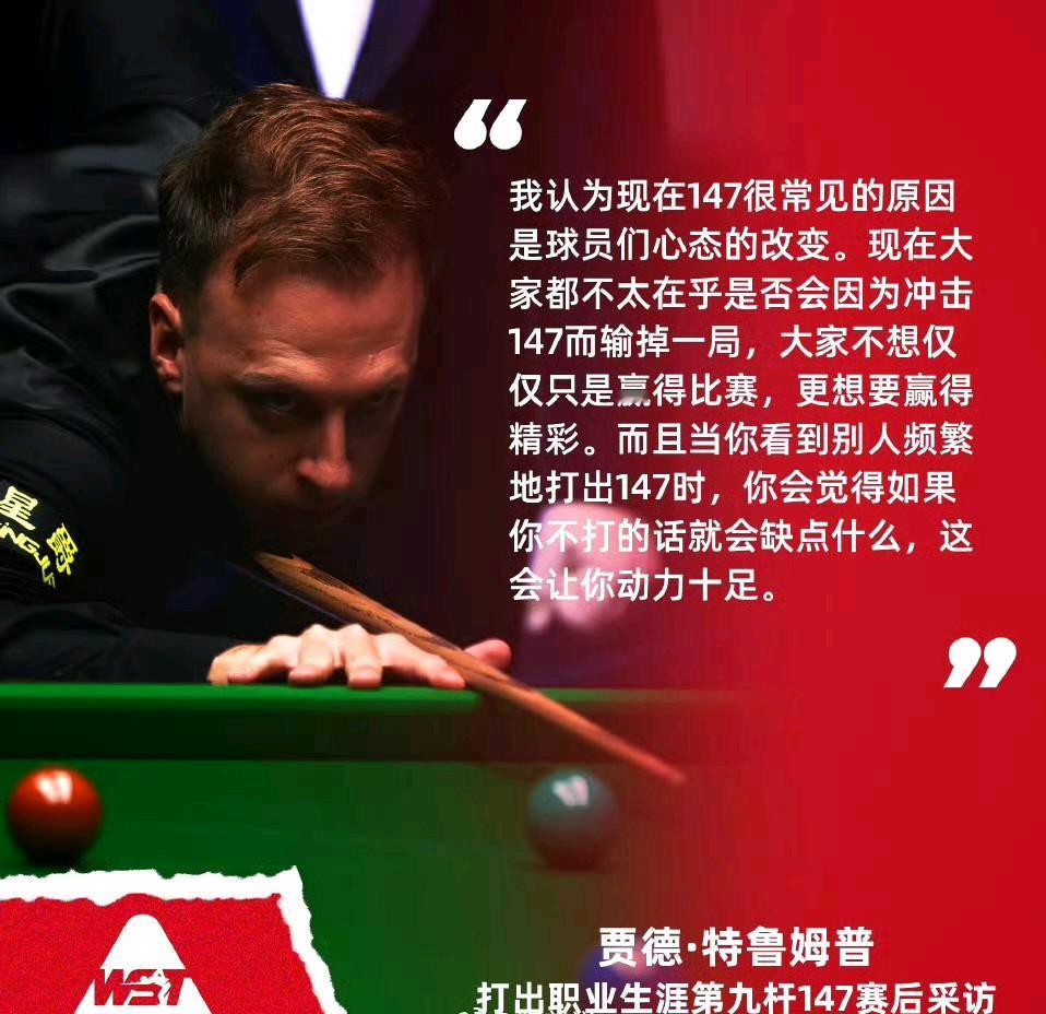 时隔近三年,特鲁姆普在西安大奖赛首轮再轰满分杆,小特以9杆147追平宾汉姆,并列历史第5。 前四分别是奥沙利文、希金斯、亨得利、墨菲。 赛后他总结了现在球员为什么喜欢打147的原因。