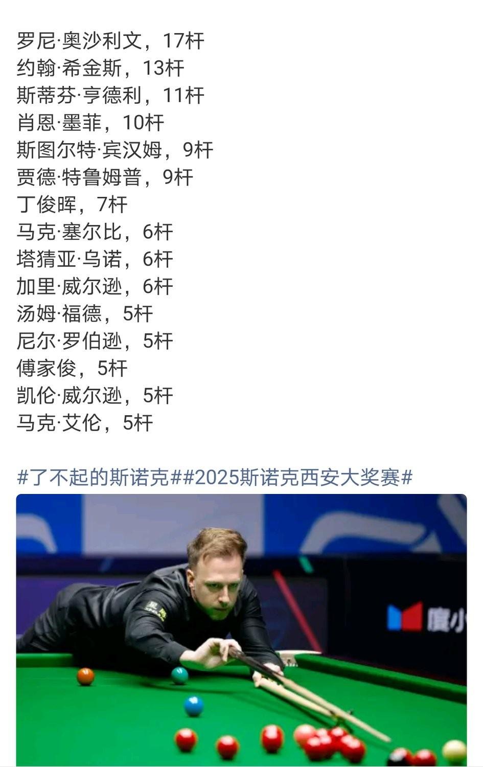 时隔近三年,特鲁姆普在西安大奖赛首轮再轰满分杆,小特以9杆147追平宾汉姆,并列