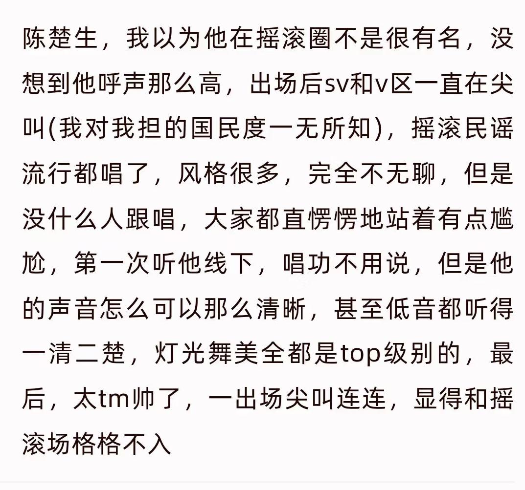 陈楚生北京音乐节被路上夸夸夸。 今天刷到了很多路人看了陈楚生音乐节舞台的反馈。