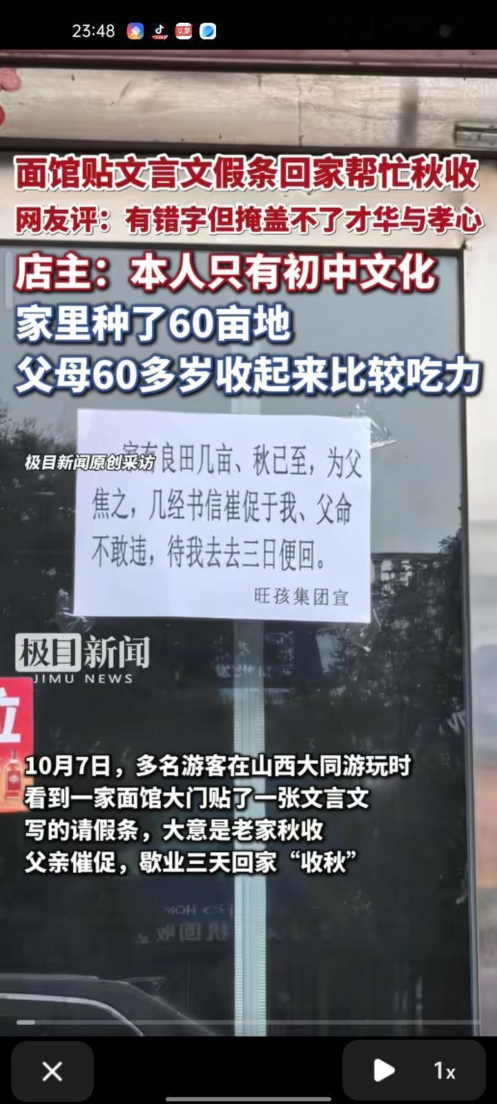 10月7日,山西大同。多位游客在大同游玩时,看到一家面馆大门贴了一张文言文写的请假条,大意是老家秋收,父亲催促,歇业三天回家“收秋”。有网友指出,一处“为父”应该是“家父”,还有“崔”应该是“催”。 面馆老板席先生称,自己只有初中文化,闲的时候喜欢看看书报,这张请假条是随便写的,感谢网友指出差错。 这张别出心裁的请假条吸引了多名游客的关注。文言文是偏雅致的传统文化载体,这种 “小馆子写古文” 的组合,本身就容易勾起人的好奇心。即便有文字差错,也未减分反而更显真实,老板坦诚 “初中文化,随便写的”,其实有些字经常有通假字,这也让出圈少了功利感,多了人情味。 但对许多从农村来到城市打拼的人而言,“父亲催促收秋” 更是熟悉的生活片段。 一边是城市里的营生,一边是老家的牵挂,这种 “两难” 与 “选择”,藏着普通人的责任与温情,很容易引发情感共鸣。 席先生还介绍,老家在朔州市右玉县元堡子镇大油坊头村,目前成熟的庄稼收完了。7日返回大同,8日正常营业。
