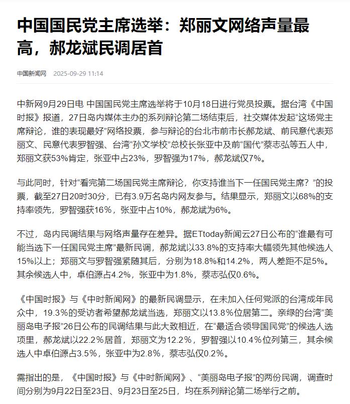 13万岛内网友投票出炉!最大的那个数字,不是郑丽文的22.2%,也不是郝龙斌的20.5%。 而是那个冷冰冰的,高达26.8%的“还没想好”。 国民党主席选举每四年一次,这次补选来得急,就像一场突然降临的考试。 朱立伦连任后,党内派系就像一群吵吵闹闹的孩子,谁也不服谁,拉锯得厉害。 再加上2024年大选失利,党员们就像热锅上的蚂蚁,急需新血注入,想着找个厉害的人物来带领国民党走出困境。 选举定在10月18日,采用党员直投的方式,单记相对多数,也就是谁拉到的票多谁就上位。 六位候选人领表后,党内可就热闹了,地方支部天天开会,就像一群人在商量着怎么打一场关键的战役,讨论谁能稳住蓝营的基本盘。 其实啊,这次选举可不单单是换个主席那么简单,这简直就是国民党的自救一战。 要是选不对人,2026年的地方选举可就悬了。 这就好比你要盖一栋房子,要是地基没打好,房子可就容易塌。 民调显示,支持率分散,未定票高居不下,这反映出党员们对党务改革的不满。 过去几年,国民党内斗频发,就像家里天天吵架,吵得人心惶惶。 派系撕扯让年轻人都流失了,就像一棵大树,树枝都被折断了,树叶也掉了不少。 你看之前的一些选举,国民党的支持率那是一路下滑。 比如2024年大选失利,就是一个明显的例子,这说明国民党确实存在不少问题。 再看看这次的候选人,郑丽文、郝龙斌他们都有自己的支持者,但谁也没能一骑绝尘。 就像一场跑步比赛,大家都在跑道上跑着,但谁也没有把其他人远远地甩在后面。 而那26.8%的“还没想好”,就像是一群在跑道边围观的人,他们还在犹豫到底该支持谁。 这也难怪党员们会犹豫,毕竟国民党这几年的表现确实不太尽如人意。 党内派系林立,就像一个江湖,各有各的门派,各有各的想法。 一些党员可能觉得,不管选谁,都很难改变国民党目前的困境。 就像你在一个迷宫里走了很久,一直找不到出口,这时候突然来了几个人说要带你出去,但你心里也在犯嘀咕,他们到底能不能行呢?而且啊,这次选举时间紧迫,候选人可能也没有足够的时间来充分展示自己的能力和政策主张。 这就好比一场相亲,两个人刚见面,还没来得及好好了解对方,就要决定是否在一起。 党员们可能也担心,万一选错了人,国民党可就真的要“病入膏肓”了。 所以说啊,这13万网友投票中那26.8%的“还没想好”,其实反映出了国民党目前的尴尬处境。 党员们对党务改革有期望,但又对候选人不太放心。 这场选举对于国民党来说,真的是一场大考,能不能交出一份满意的答卷,就看他们能不能选出一个真正有能力、有威望、能团结党内各方力量的主席了。 要是选不好,国民党在2026年地方选举中可能就要吃大亏,到时候可就真的要“喝西北风”了。