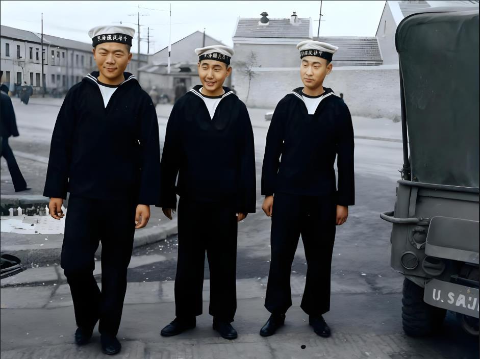 1945年的青岛,海风裹挟着历史的余韵掠过街道。三位民国海军军人立于砖石路面上,身着黑色水手服,领口、袖口镶着清爽的白色饰边,如浪涛边缘的银线;白色海军帽端正戴在头上,帽箍处“中华民国海军”的字样清晰醒目,透着制式服装的规整与庄重。