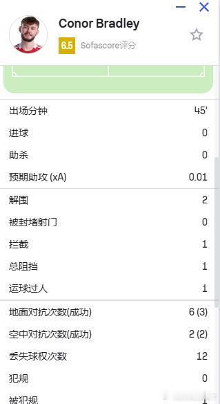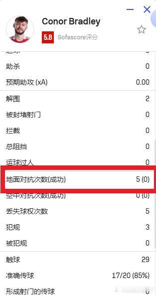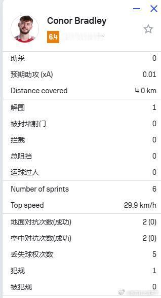 在过去的两场比赛中,布拉德利参与了 9 次对抗,但全部失败
