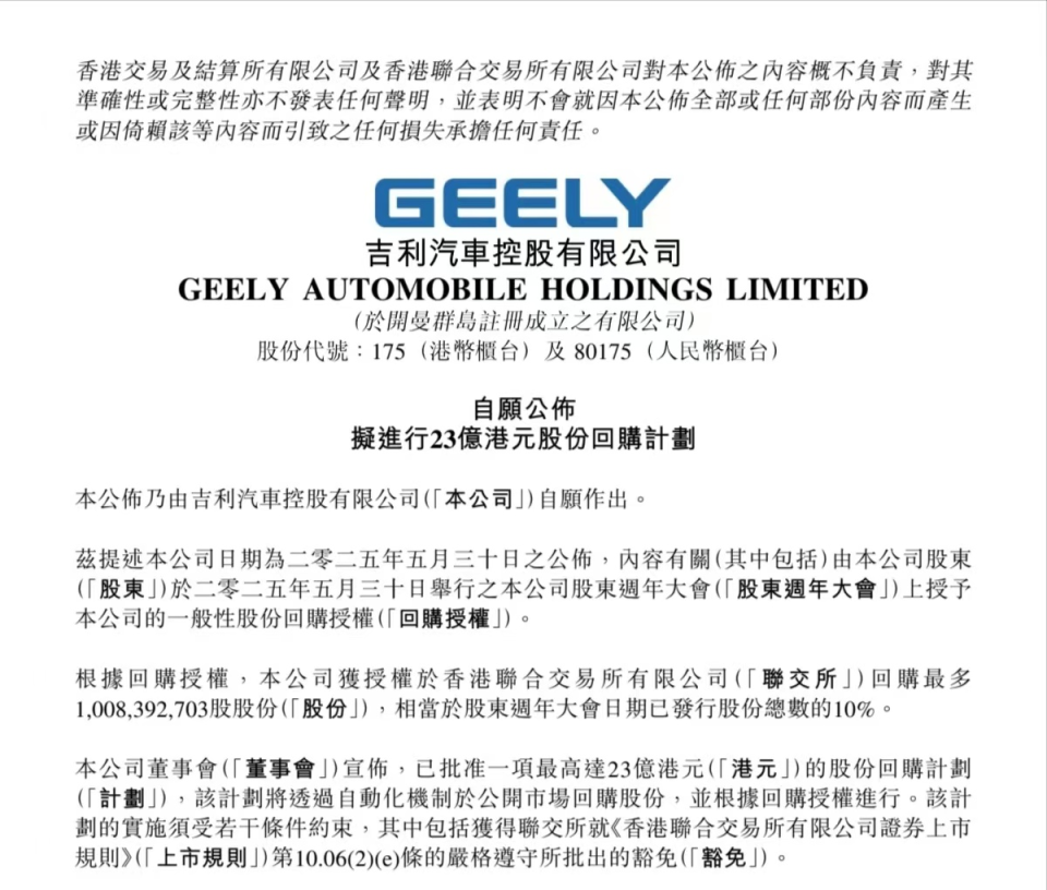 根据公告,这次回购计划基于2025年5月30日股东年会上授予的一般性股份回购授权进行。根据该授权,吉利汽车可回购最多不超过10.08亿股股份,相当于公司已发行股份总数的10%。该计划的实施还需满足一定条件,其中包括获得联交所就《香港联合交易所有限公司证券上市规则》相关条款的严格遵守所批出的豁免。公司明确承诺,在回购完成后的30日内将不再发行新股。这一安排进一步强化了回购计划对股本结构的优化作用。吉利汽车董事会认为,实施这一计划“符合公司及其股东的整体最佳利益”。在当前市场环境下,这一举措旨在展示公司对业务前景的信心。