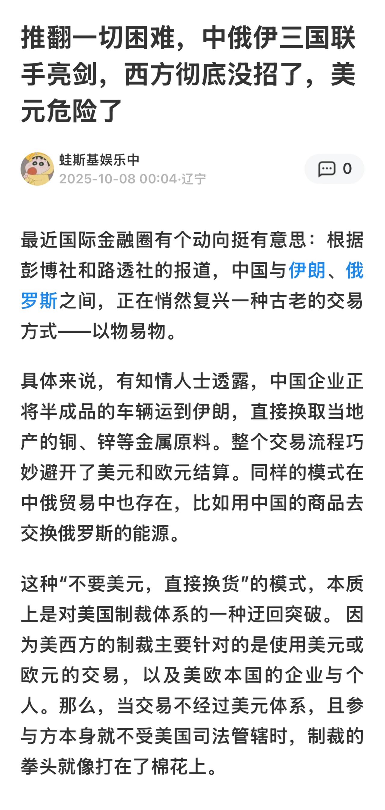 专家表示,易货贸易不涉及外汇,企业需经政府批准或具备特定资质方可进行。2022年俄乌冲突后,美国对俄制裁影响部分中企,促使中国各地政府推动易货贸易,并扩大国有企业参与资质。这类交易虽不影响整体贸易体系,但效率较低,并非长久之计。 不过,此举反映出各国正尝试避开美元结算,导致全球贸易趋向碎片化。若此类新方式广泛使用,长期可能削弱美元的国际主导地位,甚至引发与美国金融体系的脱钩。