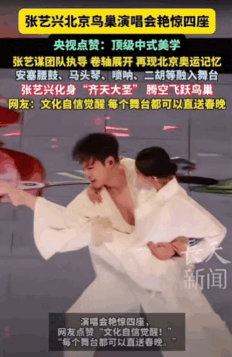 罕见!央视新闻,人民日报,新华社三方认证。 张艺兴北京鸟巢演唱会央视新闻不仅点了赞,还赞扬道这是顶级的中式美学。 这场由张艺谋团队导演,李连杰武术指导的演唱会,为观众们呈现了一场精彩绝伦的视听盛宴。 《千里江山图》《百蝶图》再现北京奥运会记忆,马头琴、安塞腰鼓唢呐,二胡等乐器的融合更是惊艳四座。放眼全国,张艺兴是独一份了。 难怪这场演唱会两日现场观众超过了14万,线上观看直播的人次更是达到了惊人的2053万。 连外国乐迷都感叹道:“中国制作,领先100年”。 央视更是不吝啬的赞扬道:“传统即顶流”。