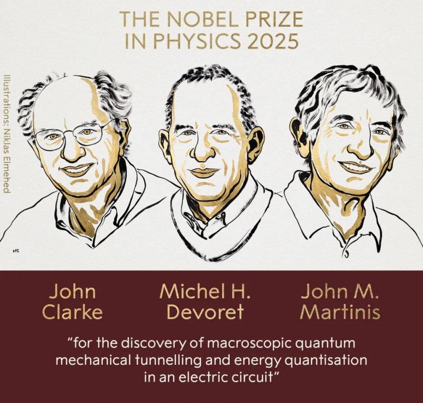 2025诺贝尔奖~2025年诺贝尔物理学奖授予了三位科学家:约翰• 克拉克(JohnClarke)、米歇尔•德沃雷(Michel H. Devoret)和约翰• 马丁尼斯(John M. Martinis),以表彰他们"在电路中发现宏观量子隧穿与能量量子化”的成就。他们让量子力学从原子与电子的微观舞台,跃上了可以触摸的人类尺度。 约翰•克拉克John Clarke 出生于 1942 年于英国剑桥,从剑桥大学获得 B.A. (1964年)、Ph.D.(1968年),后来于 2005年获授Sc.D. 学位。 1968年,他来到美国加州大学伯克利分校,担任博士后研究员;次年(1969 年)他被聘为物理系教员,正式开启长期的伯克利教学生涯。 米歇尔•德沃雷Michel Henri Devoret 出生于1953 年法国巴黎。他于 1975年毕业于巴黎国立高等电信学院,获得工程学位,1982年在巴黎第十一大学 Orsay 校区获得物理学博士学位。 博士毕业后,他前往美国加州大学伯克利分校,在 John Clarke的实验室从事博士后研究,主要探索宏观量子隧穿等前沿问题。 约翰•马丁尼斯John Martinis 出生于 1958年,是美国著名物理学家。在加州大学伯克利分校,他于 1980年获得物理学学士学位,随后在伯克利继续深造,于1985年(有些资料说1987年)完成博士学位。他的博士研究聚焦于约瑟夫森结的宏观量子隧穿与能级量子化,是他日后进入量子电子器件领域的重要起点。 在完成博士后阶段,他先后在法Saclay 的 CEA 实验室和美国国家标准与技术研究院(NIST)工作。
