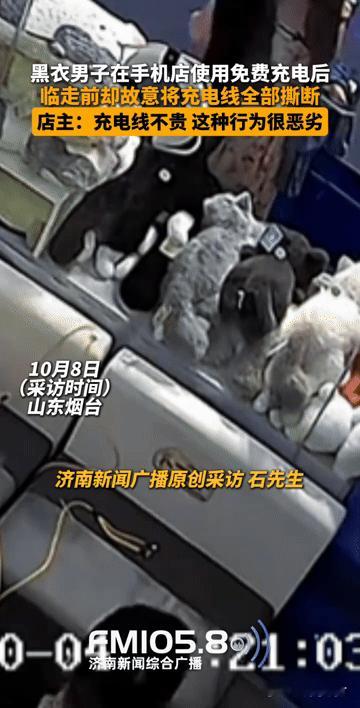 免费充电后竟干这事儿!烟台一男子撕断手机店所有充电线,店主气到失眠 “免费充电是方便大家,他却干出这种事!”10月8日,山东烟台一家手机店的店主石先生满是无奈。 监控画面里,一名黑衣男子在店里享用完免费充电服务后,临走前竟故意将所有充电线全部撕断。石先生当晚查完监控,气得彻夜难眠。他坦言,充电线虽不值多少钱,但这种恶意破坏的行为实在恶劣。 免费便利本是善意,却被如此举动“泼了冷水”。这种损人不利己的操作,着实让人难以理解。