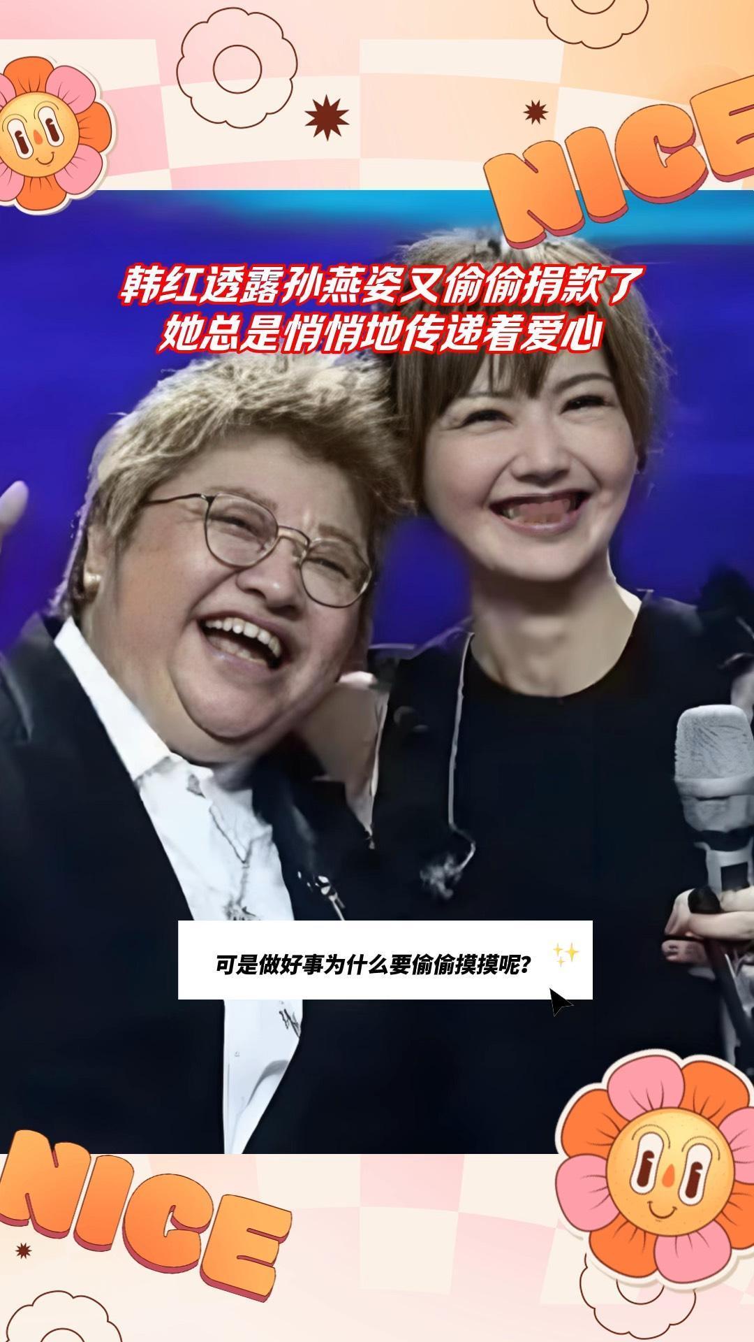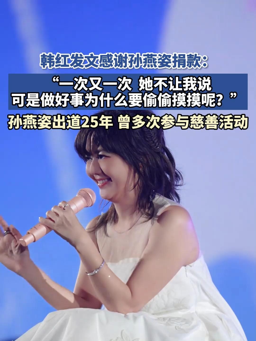10月7日,在北京举办的韩红演唱会上,韩红透露好友孙燕姿多年来通过基金会匿名捐款超千万,一直以“孙女士”署名。此前,韩红就曾发文感谢“孙女士”的公益捐助。韩红觉得应该宣扬好人好事、传递正能量,这一观点在现场引发共鸣。 当天,孙燕姿前一日因重感冒输液,却依旧搭乘早班机抵京演出。她发文回应,称因事耽误了两班飞机,但身为朋友,自己必须到场。她还盛赞韩红在公益之路上照亮他人。孙燕姿默默投身慈善,其低调与善良令人由衷敬佩。 韩红 韩红爱心人士 韩红慈善 孙燕姿