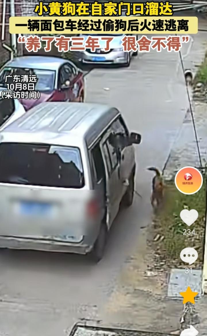 太可恶了!广东清远,视频中一只小黄狗被一辆路过的面包车偷走,然后迅速逃离。 据