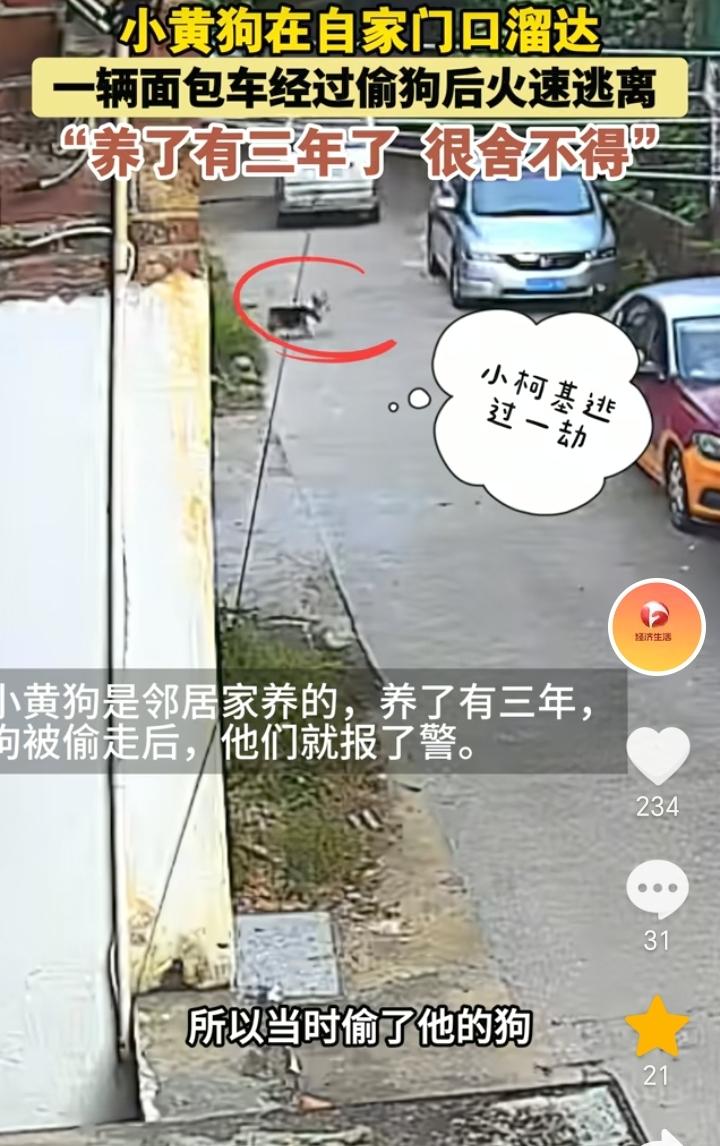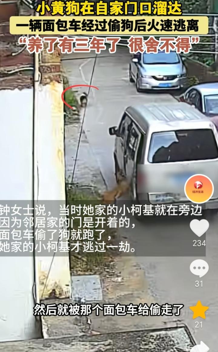 太可恶了!广东清远,视频中一只小黄狗被一辆路过的面包车偷走,然后迅速逃离。 据AHTV第一时间报道,10月8日广东清远,钟女士爆料,邻居家养了三年的小黄狗在自己家门口溜达,被经过的面包车给偷走了,当时她家的小柯基就在旁边,因为邻居家门是开着的,面包车偷了小黄狗就跑了,小柯基才逃过一劫,目前邻居家已经报警。 偷狗的人不仅胆大而且还非常的可恶,跑人家门口去偷狗,视频中可以看到,车是在缓慢行驶中里面的人直接开门把狗套走,手法相当的熟练,由此可见这些人应该就是惯犯。 狗被偷走后,下场无非就是卖到市场,或者就是上了餐桌,就因为有利可图所以才会有人铤而走险。 这件事的发生,也是给养狗的人提了个醒,如果人不在家那就最好是把狗拴在家里面,这样避免狗跑出去被偷走。