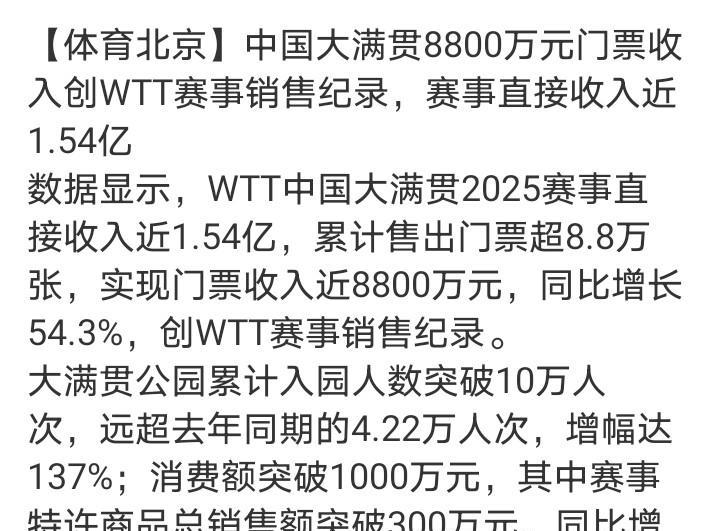 中国大满贯赛,WTT赚翻翻了。 #万能生活指南# 中国大满贯赛门票收入是8800万元人民币。 加上其他收入,直接总收入达到1.54亿元,比去年大满贯赛增加54.3%。 运动员奖金是200万美元,约合1400万人民币,扣除了奖金还有1.4亿元。 WTT收益就是总收入减总支出。 支出方面,主要就是场地租金和裁判员等工作人员的工资等。当然,赞助商的赞助应该是无偿的。 总的来说,还得是在中国办大满贯赛合算,各方面都是赚得盆满钵满。 也有人觉得,收入这么高。运动员的奖金是不是太低了?特别是阿鲁那们,一轮游的奖金都不够来回机票、住宿等开支的。 但不参加的话,就没有积分,没有伤病等理由,甚至还要被处罚。 中国大满贯赛确实赚钱了,但也要看到,在一些WTT举办的其他赛事,有的连门票都卖不掉,看台上都没人,赚的就少了。 希望明年的中国大满贯赛,收益再上一层楼,最好将一轮游的运动员加点奖金,不至于亏本参赛,那样也才更有积极性。 大家觉得是不是应该这样?