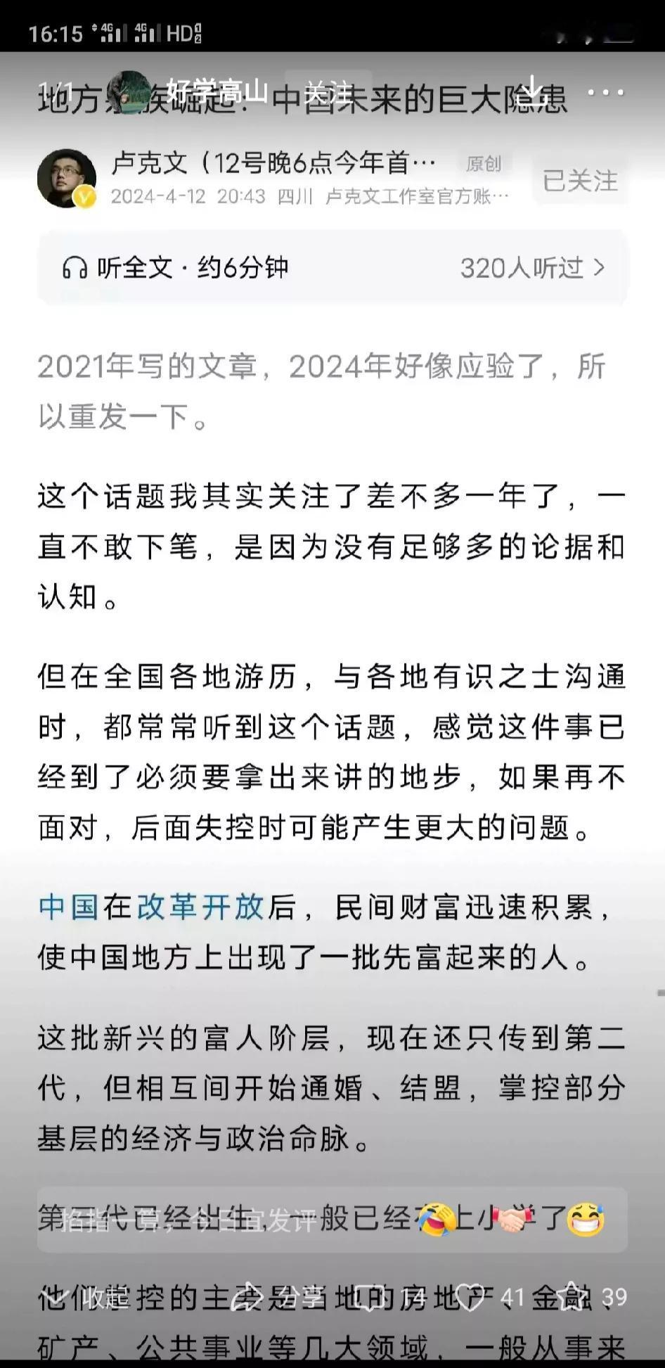 偶尔看到卢克文的一篇长文,"地方宗族崛起是未来中国的巨大隐患"。 那是扯淡,可以说扯淡也不会。 宗族的最大价值,就是它是传统文化的最佳载体,也是传统文化和传统道德的蓄水池。是民族传承的一个重要枢纽。 这个有点深,卢克文的思维能力抵达不了那里。 民间原子化、碎片化,对卢克文不一定有好处,对卢克文的后代也未必有好处。至于对哪类人有好处,卢克文应该清楚。 我再来举个例子,在我的老家,大家族的孩子,学习成绩确实更好,待人接物和做生意也更成功。这就是家学传承的价值。 而小家族的孩子,则更可能坠入社会最底层,交际手段也更差。 宗族当然也有负面影响,这个讨论的人很多。但正面价值远高于负面价值。 广东浙江福建的发达,就与宗族的茁壮有关。
