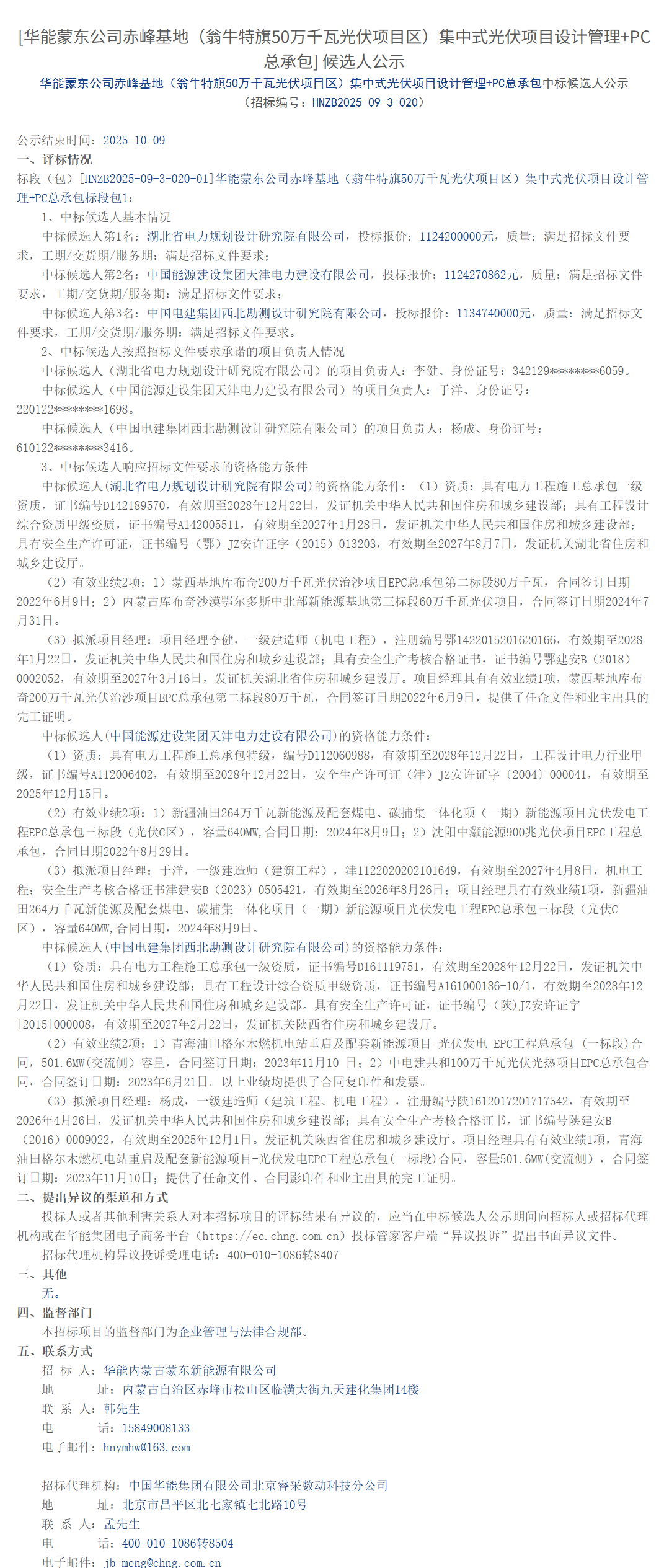 光伏头条获悉,日前,华能蒙东公司赤峰基地(翁牛特旗50万千瓦光伏项目区)集中式光伏项目设计管理+PC总承包中标候选人公示。