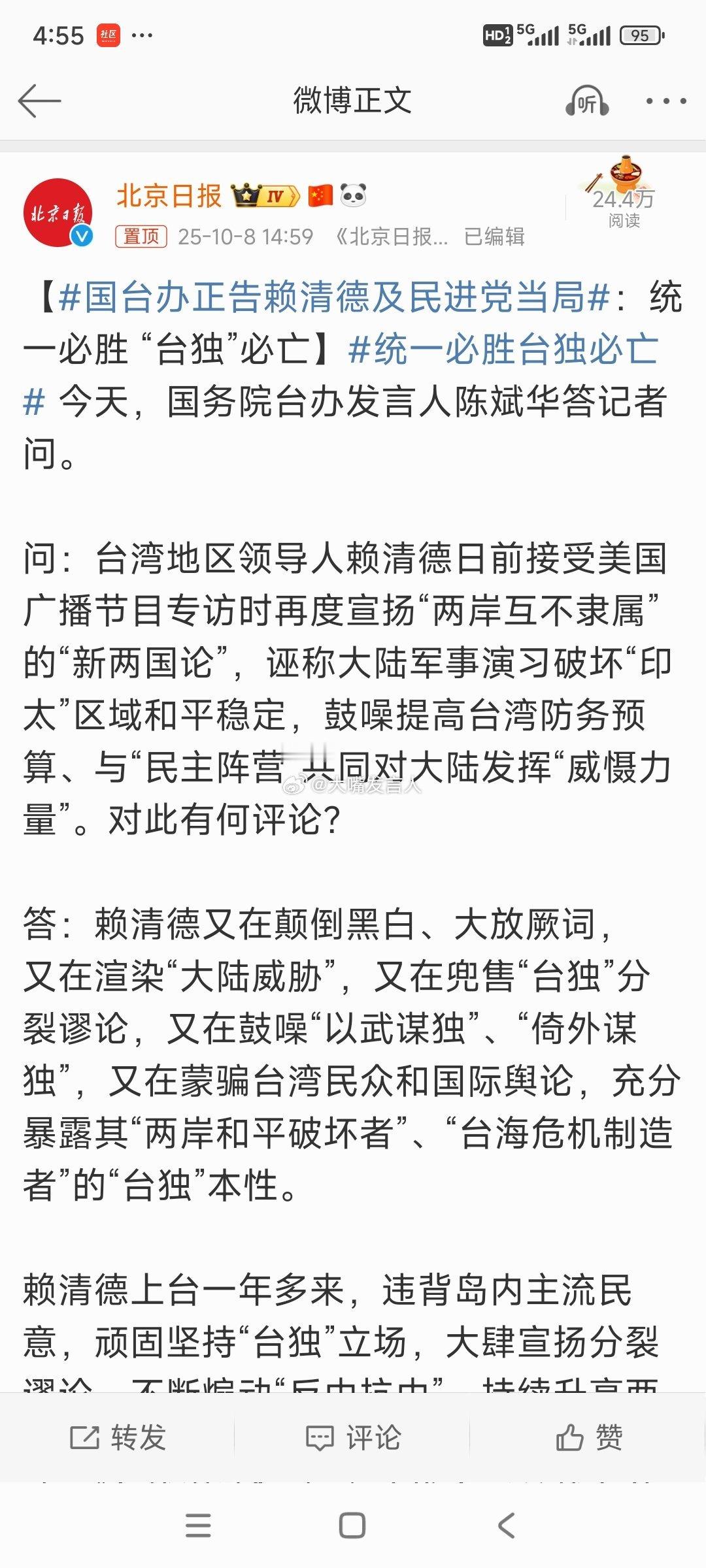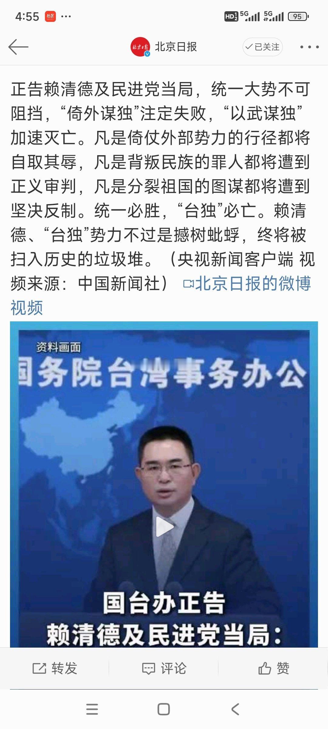 热点评论 ,国台办正告赖清德及民进党当局