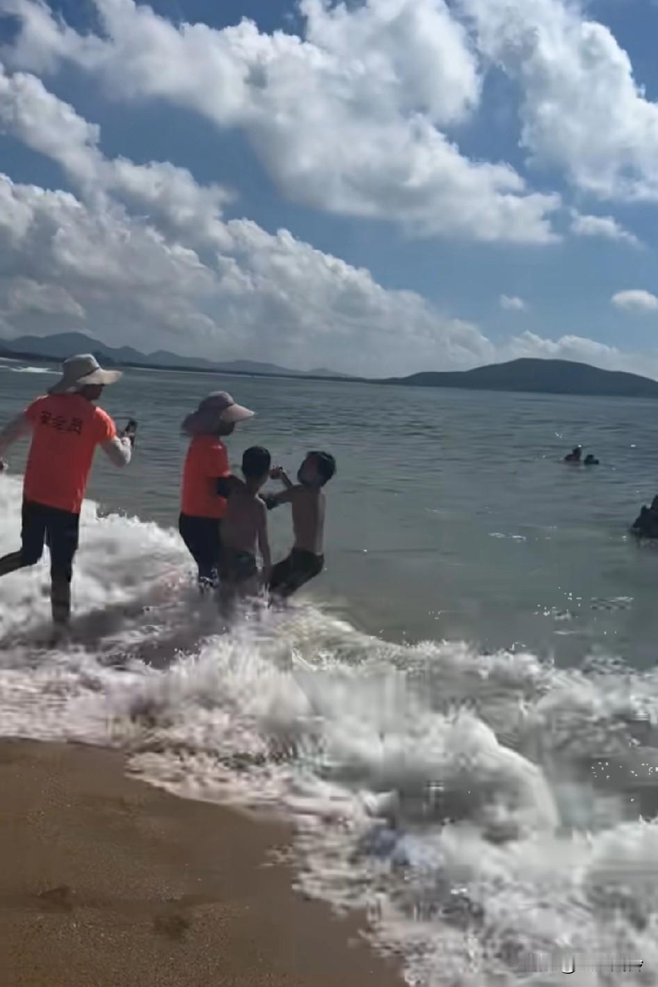 小朋友不穿救生衣下海,救生衣劝阻不听,然后就拉扯打起来 广西一般都是很负责任的,溺水了又是景区赔钱,就算赔了钱,良心也过意不去。所以必要时给小孩几巴掌,这位大哥已经尽到责任了。他的父母由始至终都没出现过,应该是本地人,附近居住的,然后父母也是放养式。 这种海水的颜色一看就是深水区,里面水母咬人是真疼,没出事就是安全员态度不好,出了事就是安全员不负责任,社会一直这样。