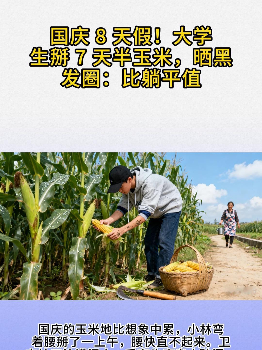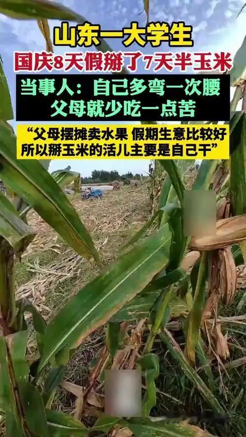 国庆八天假期,青岛农业大学大一学生孟成掰了七天半玉米。他家有五亩玉米地,临近秋收时天降大雨,收割机无法下田作业,玉米还被雨水淋湿。若不及时掰回家晾晒,玉米就会发霉发芽,父母半年的辛苦便付诸东流。 9月30日晚,孟成回到老家,10月1日上午便开始掰玉米,直至8日中午才准备返校。他的父母都已年逾五十,国庆期间忙着摆摊卖水果,掰玉米的重任主要落在了他的肩上。同学陈浩宇也帮自家掰了三天玉米,还抽空到孟成家帮忙。 孟成认为自己是农村孩子,多弯一次腰,父母就能少受一份累,他还将自己掰玉米的过程拍成视频分享出来。这个假期,别人都在游玩,他却在田间辛勤劳作,实在是难能可贵! 山东大学生实践 山东收玉米 青岛农业大学