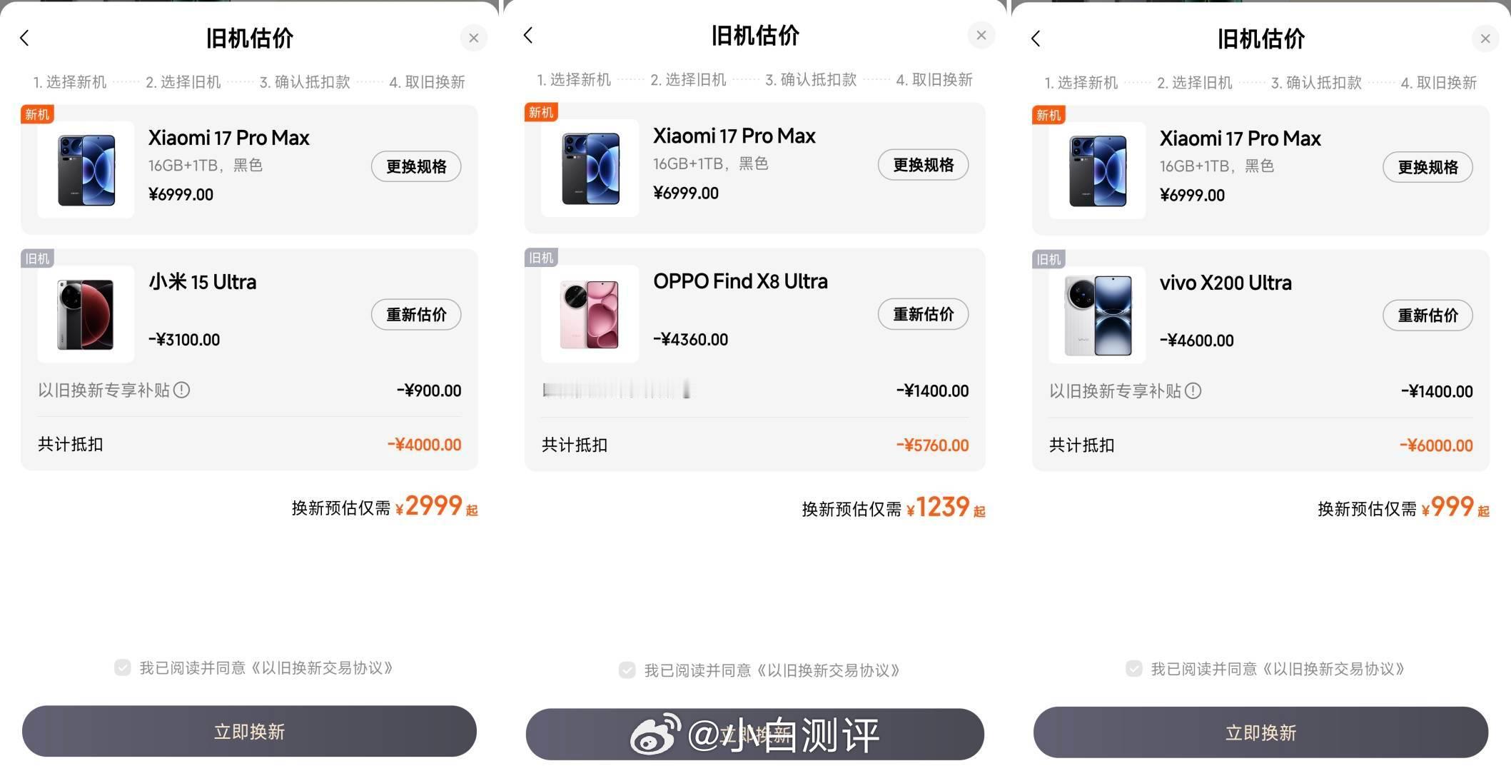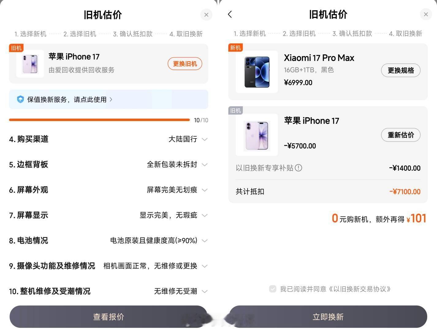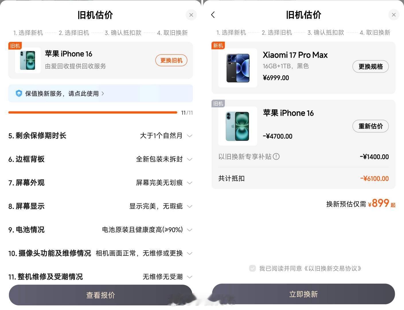 看了下小米官方商城的以旧换新服务,机型选择1TB顶配的小米17 Pro Max,选择旧机时都选顶配、全新未拆封(图1),能看到OVM三家上代顶配Ultra的旧机抵扣差别还蛮大的(图2)(PS.上代OVM三家Ultra顶配卫通版发布时最高价格均为7999元),再看一下512G顶配的iPhone标准版(图3、图4)(PS.iPhone 16顶配发售价8999、iPhone 17顶配7999)。
