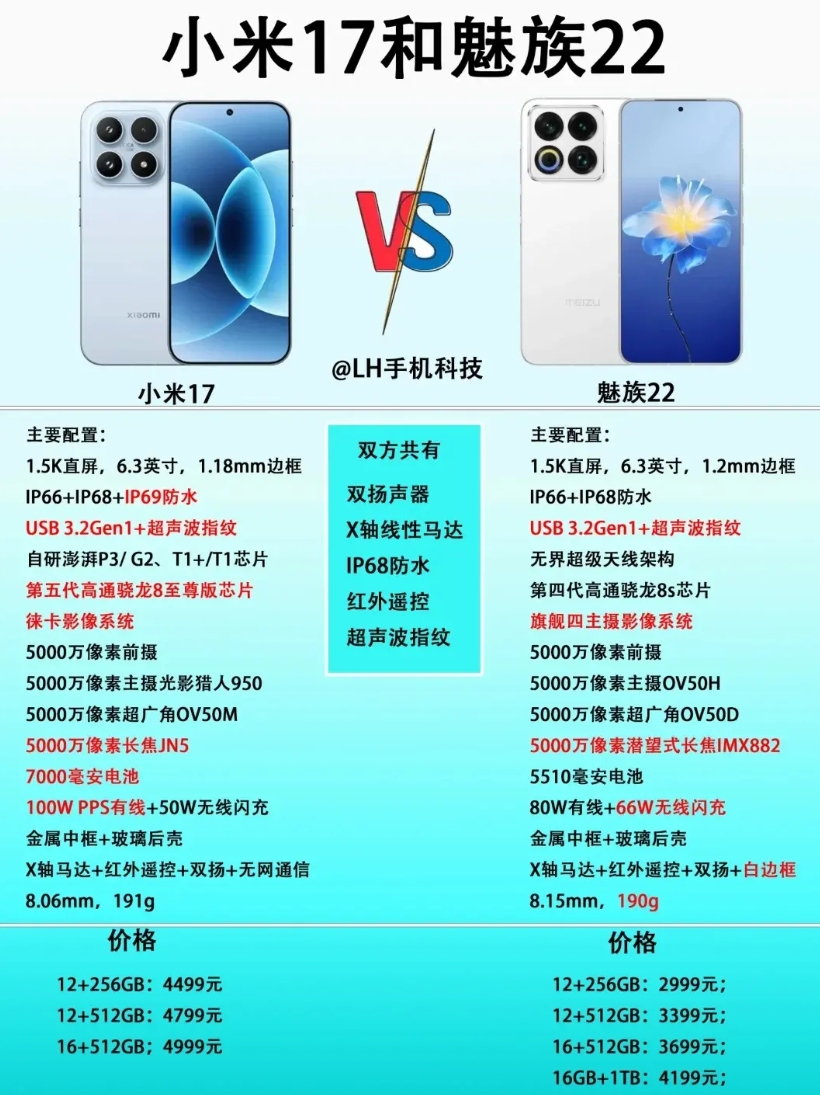 小米17和魅族22谁更好看? 从尺寸和颜值来说,大家认为小米17和魅族22哪个更好看呢? 虽然不是一个价位,但小米17和魅族22都属于小尺寸手机范畴。只是碍于成本,魅族22妥协了,但价格也低不少。 小米17标准版设计风格变化不大,主要的优势就是有更强的第五代高通骁龙8至尊版芯片,有更大的7000毫安电池以及更均衡的配置。 魅族22虽然便宜但也不是没有优势,比如有潜望式长焦镜头和66W无线闪充。除了处理器,外围配置也是标准的旗舰配置。 小米17和魅族22都是6.3英寸屏幕,小米17正面1.18mm极窄边框,魅族22是1.2mm极窄边框但有白色前面板。至于谁好看,大家自行评论吧。