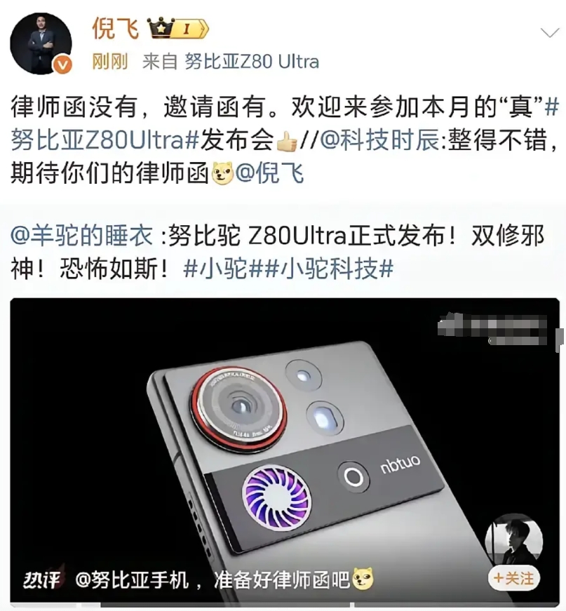 还是努比亚比较大气啊… 前一段时间,博主羊驼的睡衣,之前恶搞的小驼16手机,小驼16发布会视频被官方举报到下架了,被某品牌高管威胁要用法律手段起诉。 近日,羊驼的睡衣又出来恶搞努比亚最新手机了,但是和小驼16手机视频截然相反,努比亚高管发文说:律师函是没有的,邀请函有,还要欢迎来参加本月的努比亚Z80Ultra发布会。 努比亚真大气,被人调侃都没事。