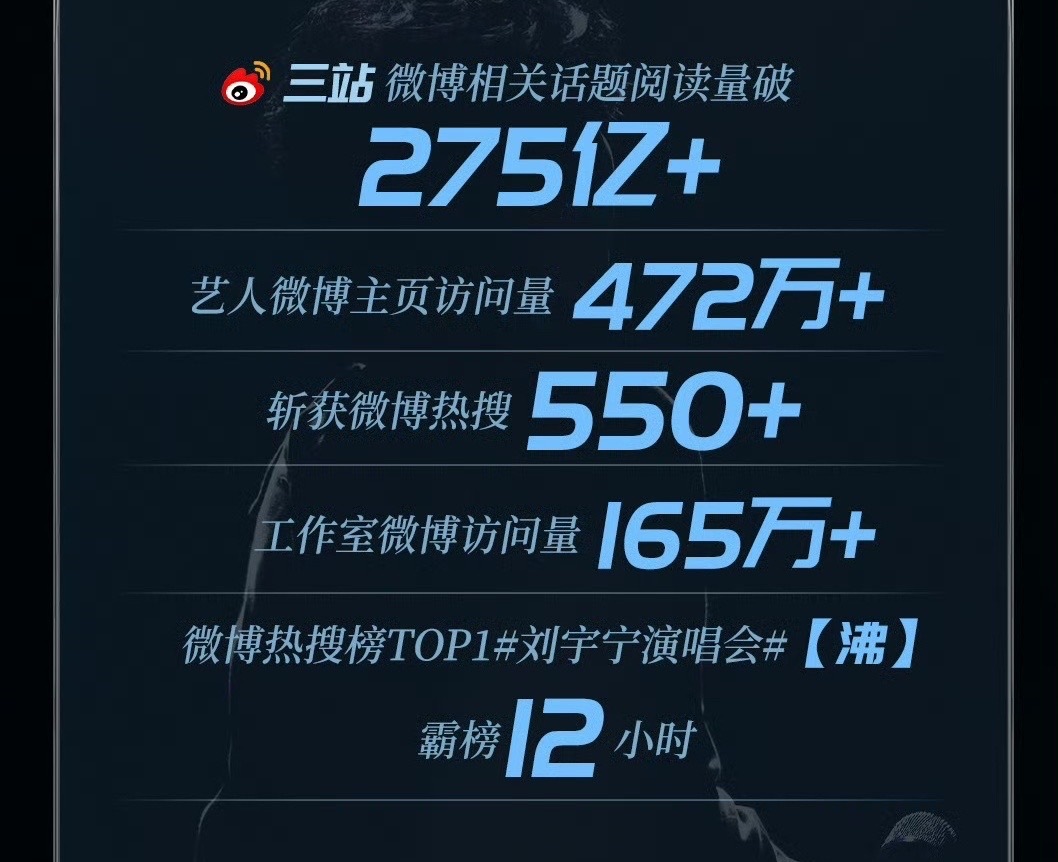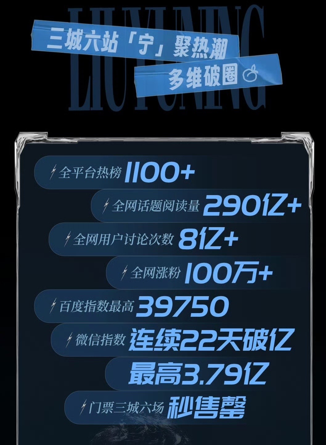 :均双场齐开秒售罄,全平台涨粉100w+,百指最高39750,微指连续22天破亿,最高3.79亿,刘宇宁主页访问量472w+,工作室访问量165万➕
