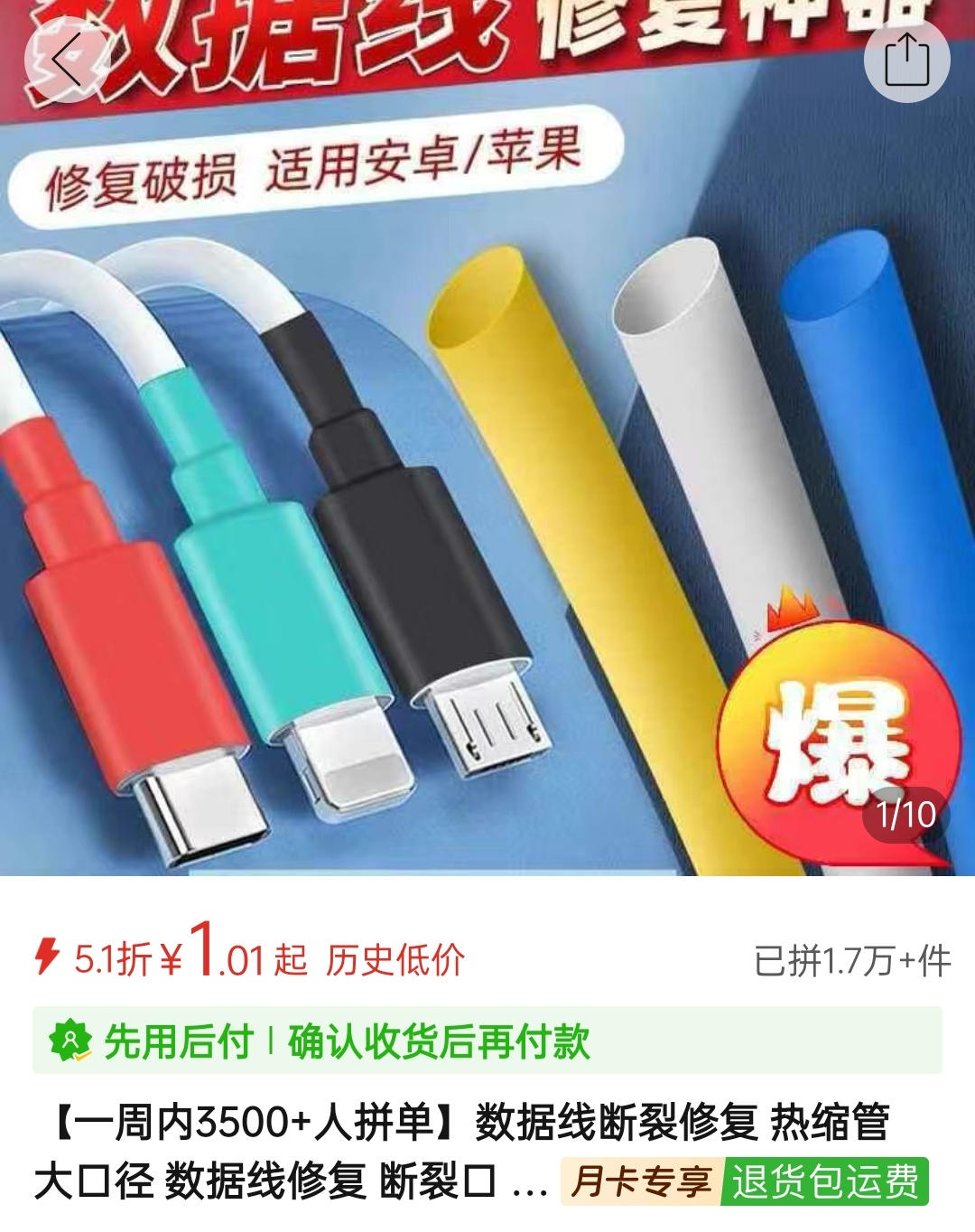 数据线用久了,连接处的线不是会破吗,用下面的这个超便宜神器,一两块10个了,套上去用打火机烘一下就裹住了,真的好用