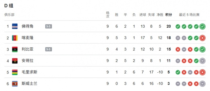 直播吧10月08日讯世预赛非洲区D组第9轮,佛得角连扳两球3-3战平利比亚,坐拥姆伯莫、奥纳纳、巴莱巴和安古伊萨等多位名将的喀麦隆2-0击败毛里求斯。