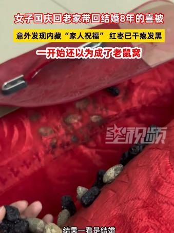 万万没想到!广东,女子打扫卫生,在柜子里发现8年前结婚铺床用的喜被,她心想里面肯定有红包,打开一看她傻眼了!红枣已经干瘪发黑宛如煤炭,榄子也已经发霉。女子发视频吐槽,结婚8年的枣子还在这,儿子都三个了!网友:怪不得生那么多儿子。 国庆刚过,广东茂名的李女士趁着晴好天气整理衣柜,当她费力拖出压在箱底的龙凤喜被时,被角传来的硌触感让她愣了愣。 这床绣着缠枝莲纹样的喜被是八年前出嫁时母亲亲手缝制的陪嫁,红棉线锁边的针脚细密紧实,她一直当纪念品藏着,从未舍得盖。 拆开被角缝线的瞬间,一个红布小包掉了出来,灰尘簌簌落在地板上,里面滚出的几颗硬物让她吓了一跳。 深褐色的表皮皱缩得像老树皮,发黑发硬的模样乍一看竟像老鼠屎。 直到指尖触到枣核的轮廓,李女士才猛然反应过来。 这不是老家粤西婚嫁时藏在喜被里的红枣和榄子吗?她捏起一颗红枣,表皮轻轻一碰就掉渣,可那圆润的形状还清晰可见。 这个意外发现像把钥匙,打开了记忆的闸门,也让她瞬间读懂了母亲当年欲言又止的眼神。 看着客厅里打闹的三个儿子,她忍不住笑出声,外婆的祝福藏得也太深了,现在才让我发现! 无独有偶,安徽亳州的赵女士结婚12年后晒喜被,竟从被角摸出了干透的葱段,才明白父母盼孩子“聪明”的心意。 这些跨越地域的“迟到发现”,都指向了同一个温暖的源头,藏在针脚里的传统婚俗。 “喜被藏物是典型的‘压箱底’文化,早在《礼记·昏义》里就有记载,婚礼的核心诉求之一便是‘继后世’。” 在粤西及周边地区,红枣谐音“早”,榄子取“揽子”之意,合起来就是长辈盼新人“早生贵子”的祝福。 讲究些的人家还会加花生、桂圆,凑成“花着生”“圆圆满满”的好彩头。 更有说法是,缝制喜被必须找“全人”,父母双全、子女成双的女性,用红线从被头缝到被尾,不能断线,寓意婚姻圆满顺遂。 这些藏在喜被里的“秘密”,在社交平台引发了上万网友的共鸣。 江苏网友晒出结婚十年的喜被照片,里面的花生壳脆得一捏就碎;山东网友说自家喜被里缝了栗子和枣,寓意“立子早”。 还有人吐槽“当年被子里的鸡蛋没发现,后来臭了半柜子”。 评论区里,备孕的网友抱团取暖,分享着相似的等待与感动;已为人父母的则感慨,这些干瘪的干果比任何礼物都珍贵。 如今的年轻人结婚,大多直接买现成的喜被,拍组婚纱照、走遍流程就算完成仪式,很少有人再深究老规矩里的门道。 但长辈对晚辈的疼惜从未改样,李女士用小木盒装好干果,打算等儿子们长大,讲外婆当年藏祝福的故事。 这些被时光风干的果子,早已超越了“早生贵子”的本意,成了连接传统与现代的纽带。 八年前缝进喜被的,是长辈最朴素的期盼;八年后被发现的,是藏在细节里的深爱。 信息来源:星视频2025-10-08发布视频