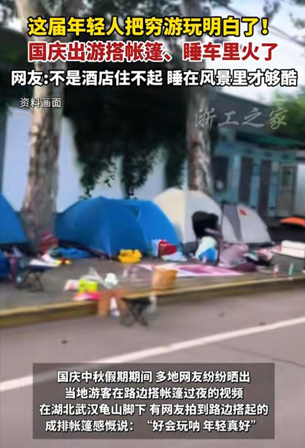 不住酒店,住帐篷!国庆假期,很多年轻人路边儿搭帐篷过夜! 近日,有网友在湖北武汉龟山脚下拍到路边搭起的成排帐篷,并感慨说:“好会玩啊你们!”此视频发到网上后引发很多网友讨论!听说还火到国外去了! 有网友说:买个帐篷才100多块钱,住个酒店却要1000多,反正晚上就几个小时而已,没必要花冤枉钱。 还有网友说:不是酒店住不起,睡在风景里才够酷。 也有网友说:年轻人搭帐篷过夜是在整顿酒店行业乱收费的现象! 小编想说:这背后其实藏着更酷的青春态度,那就是用自己喜欢的方式来享受假期,或许青春就该这么肆意潇洒,你们支持这样的做法吗?欢迎评论区留言讨论!