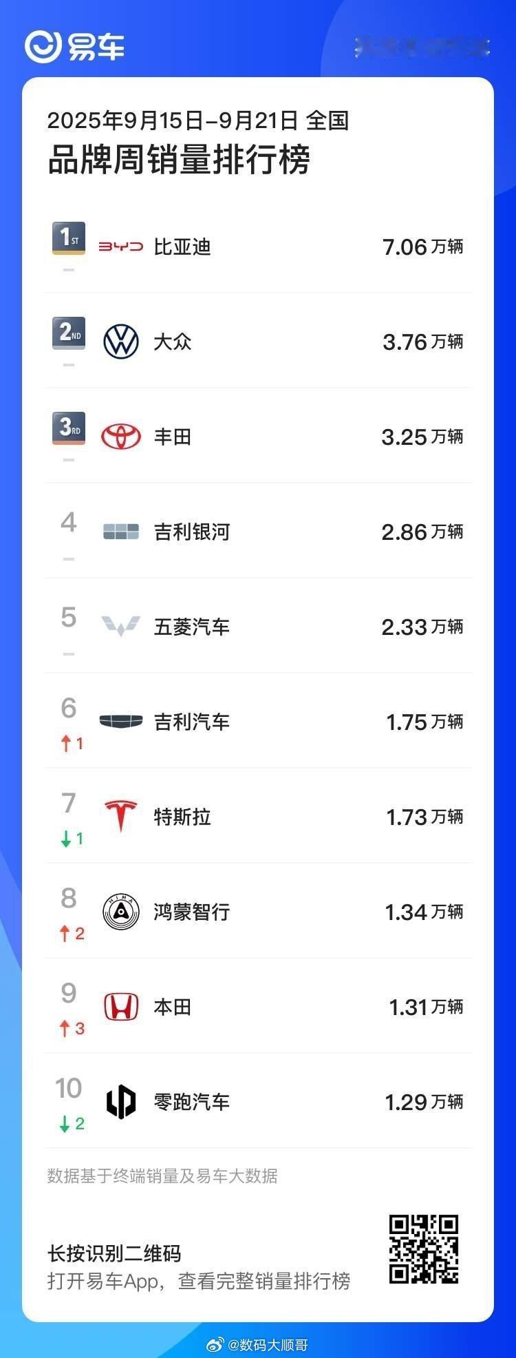 比亚迪以7.07万辆断层夺冠,大众3.74万辆、丰田3.26万辆居二三位;吉利银河、五菱等自主品牌跻身前五,特斯拉退至第七。