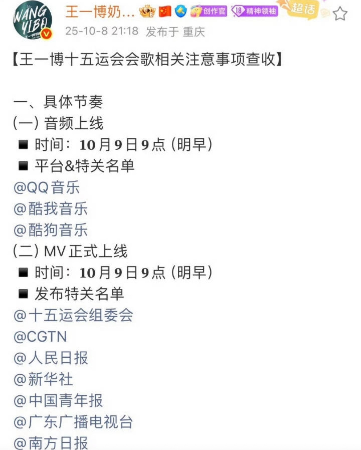 王一博明天的新歌是全运会的会歌,四年一次,不是普通的宣传曲推广曲。