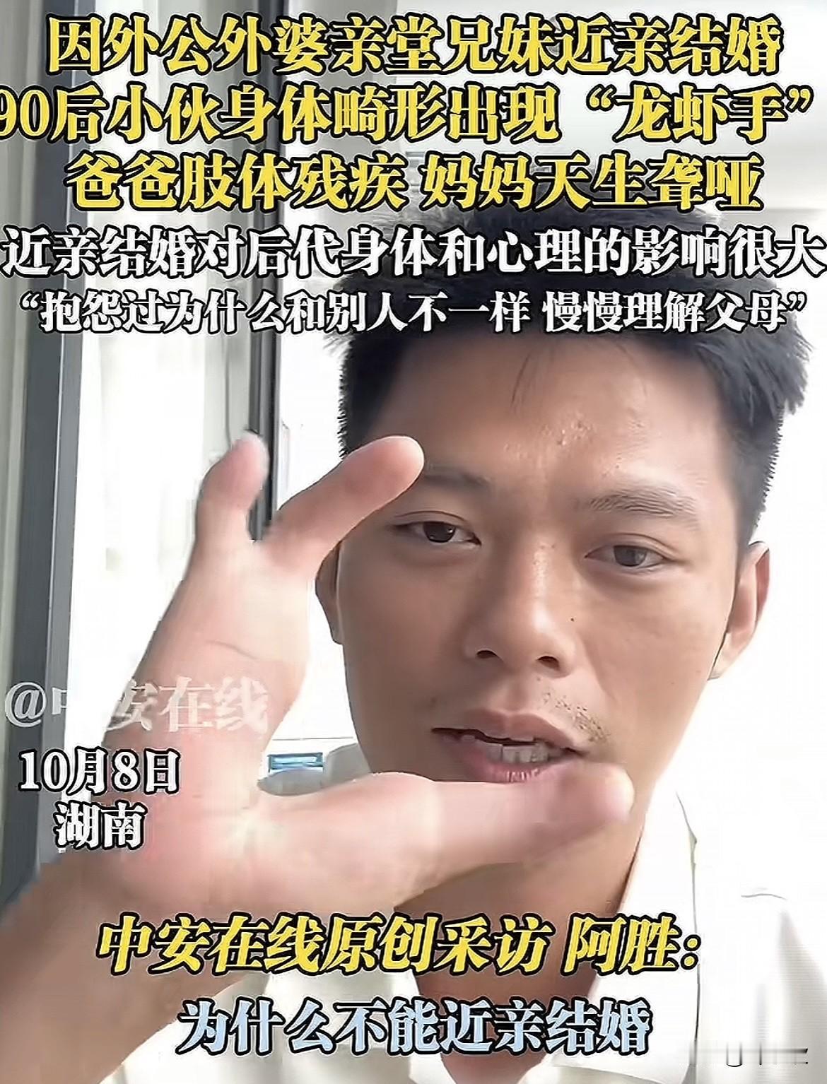 果然,人可以没有文化,但一定不能没有常识。近日湖南一名90后男子受访,称外公外婆近亲结婚,让他从小有肢体畸形。 他称,他的“龙虾手”总被同学笑,握笔要花别人几倍力气,走路也不稳,看着别人跑跳,自己只能躲在一边,心里特别不是滋味。 他外公外婆是亲堂兄妹,这种近亲关系不仅让他遭罪,母亲还聋哑,一家子都被遗传问题缠上,日常出门都得小心翼翼。 其实近亲结婚就是指直系血亲或三代以内旁系血亲结婚,我国《民法典》早明确禁止。这种婚姻会让隐性致病基因更容易配对,孩子患遗传病、畸形的风险比普通夫妻高十几倍,对家庭是长久的折磨。 或许是他外公外婆那一代真的没有这种常识吧,所以才会近亲结婚。 对此,您怎么看呢?