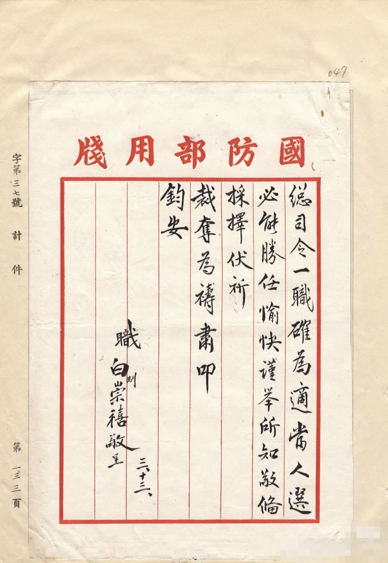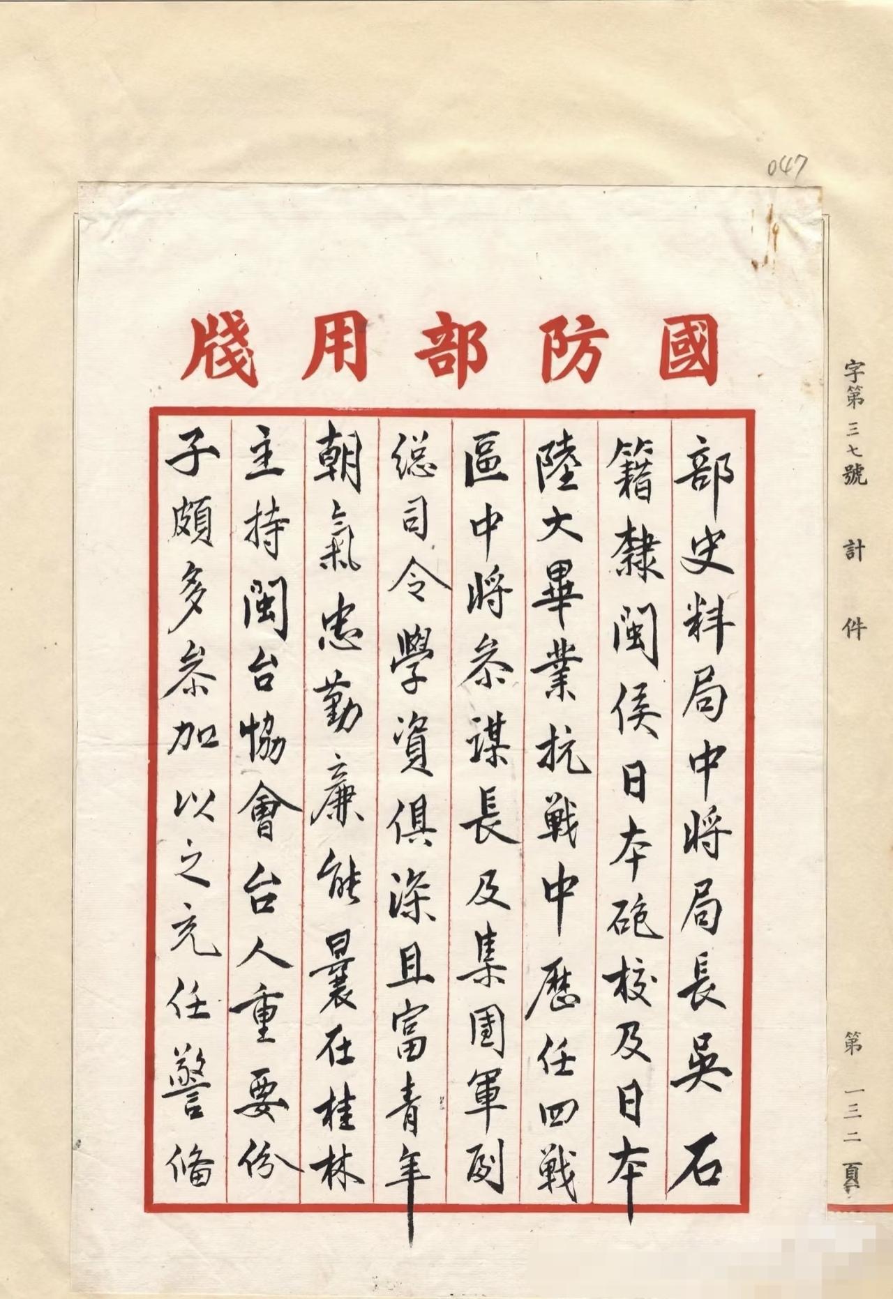 档案揭秘,白崇禧推荐吴石出任台湾警备司令! 1947年3月13日,为二二八善后,白崇禧致函蒋介石,推荐吴石出任台湾警备总司令。白指出:吴石学资俱深,且富青年朝气,忠勤廉能。