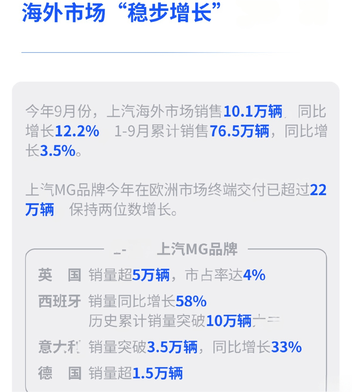 上汽集团公布9月销量数据:整车销售44万辆,同比猛增40.4%,环比大涨21%,实现同比"九连涨"!1-9月累计销量突破319万辆,自主品牌占比升至64%(同比增4.3%),新能源车单月销19万辆(+46.5%),海外市场出口10.1万辆(+12.2%)。智己LS6上市27分钟订单破万,MG4欧洲交付超22万辆,别克境L7、五菱新能源等多款车型引爆市场。上汽集团车辆销量