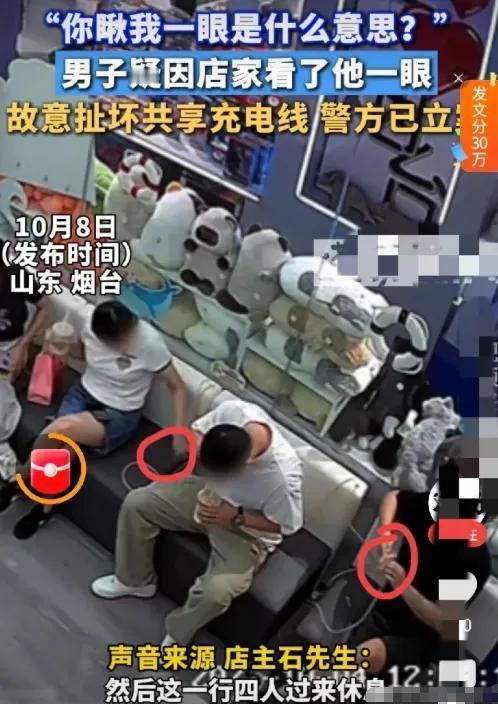 现在全网最社死的,应该就是这四位手撕共享充电线的男女了吧! 原本免费充电的善意,被他们掰成了一地断裂的线头。 10月4日中午,山东烟台万达广场一家手机店。四位外地游客走进免费充电区,店主在隔壁办公,没起任何冲突。穿黑衣的男子临走前,回头瞄了眼店员,突然用力扯断两根多功能充电线。同行白衣女子把嚼过的口香糖塞进沙发缝,另外两人看着地上的线头,一声没吭。四人并肩离开,像没发生过什么。店主查监控才发现,立马报了警。充电线值不了多少钱,但这口气咽不下——好好的便民服务,成了被糟蹋的靶子。 其实这种“免费变糟蹋”的事,早有先例。某共享充电品牌负责人说,单根多功能充电线成本约15-25元,两根就是30-50元,够买一杯奶茶。烟台警方介绍,根据《治安管理处罚法》第四十九条,故意损毁公私财物的,处五日以上十日以下拘留,可并处五百元以下罚款;情节重的,处十日以上十五日以下拘留,可并处一千元以下罚款。2023年济南某餐厅免费纸巾被游客打包20包,当事人被批评教育并赔偿;2024年青岛某景区共享充电宝被砸,当事人被拘五日。国庆期间有媒体统计,全国商圈不文明行为中,“损毁便民设施”占比12%,多集中在免费物品上——因为“不要钱”,反而成了部分人的“发泄工具”。心理学上的“破窗效应”更扎心:当有人破坏而没被制止,其他人会跟着模仿;“同伴压力”也推波助澜——四人一起时,怕被说“不合群”,就算知道错也不阻止。 为什么明明不值钱的东西,有人偏要故意破坏? ① 规则意识淡——把“免费”当“无主”,觉得破坏了不用负责; ② 情绪发泄——把生活里的委屈,撒在小物件上; ③ 同伴影响——为了“合群”,跟着做错误的事。 这不是钱的事,是对“善意”的消耗。店主花时间装充电线,是想让游客少跑一趟共享充电宝;结果换来的是断裂的线、黏在沙发里的口香糖。这种行为凉的是其他经营者的心——下次再有人想设免费区,可能先犹豫“会不会被糟蹋”。对这四位来说,监控拍得清清楚楚,全国网友都在看,这“社死”比丢一百块还难受——本来是出来玩的,现在成了“反面典型”。 有网友留言:“故意就是犯罪 必须严惩不贷!必须加倍赔偿!必须给店主精神损失费。”有人觉得“至于吗”,有人说“就该这样”——其实关键不是赔多少钱,是要让他们明白:别人的善意,不是用来被糟蹋的。 我觉得,尊重是最基本的底线。店主给你方便,你可以说“谢谢”,可以默默离开,但别动手破坏。这四位要是看到自己的行为被全网骂,估计也后悔——出来玩是为了开心,不是为了丢脸。 这事你怎么看?要是你遇到有人破坏便民设施,会站出来阻止吗?