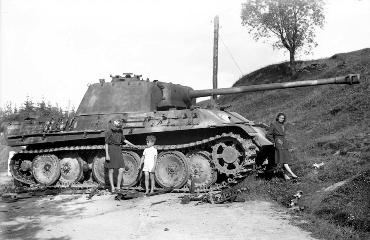 [呲牙] 大个儿玩具,坦克手贝塔一定很喜欢——1945年,捷克斯洛伐克,苏台德地区,奇梅日镇附近。一群孩子正站在一辆被遗弃的德军Pz.Kpfw. V Ausf. G型坦克上玩耍。 Pz.Kpfw. V Ausf. G "豹式"坦克是德军在二战中期服役的主力中型坦克,1944年投产,配备75毫米KwK 42 L/70主炮。G型为最终量产型号,采用倾斜装甲设计,正面防护达80-120毫米。图中坦克可能隶属南方集团军群,于1945年5月布拉格战役期间被遗弃。 据统计,捷克境内现存17辆豹式坦克残骸,多分布于南波希米亚森林地带。