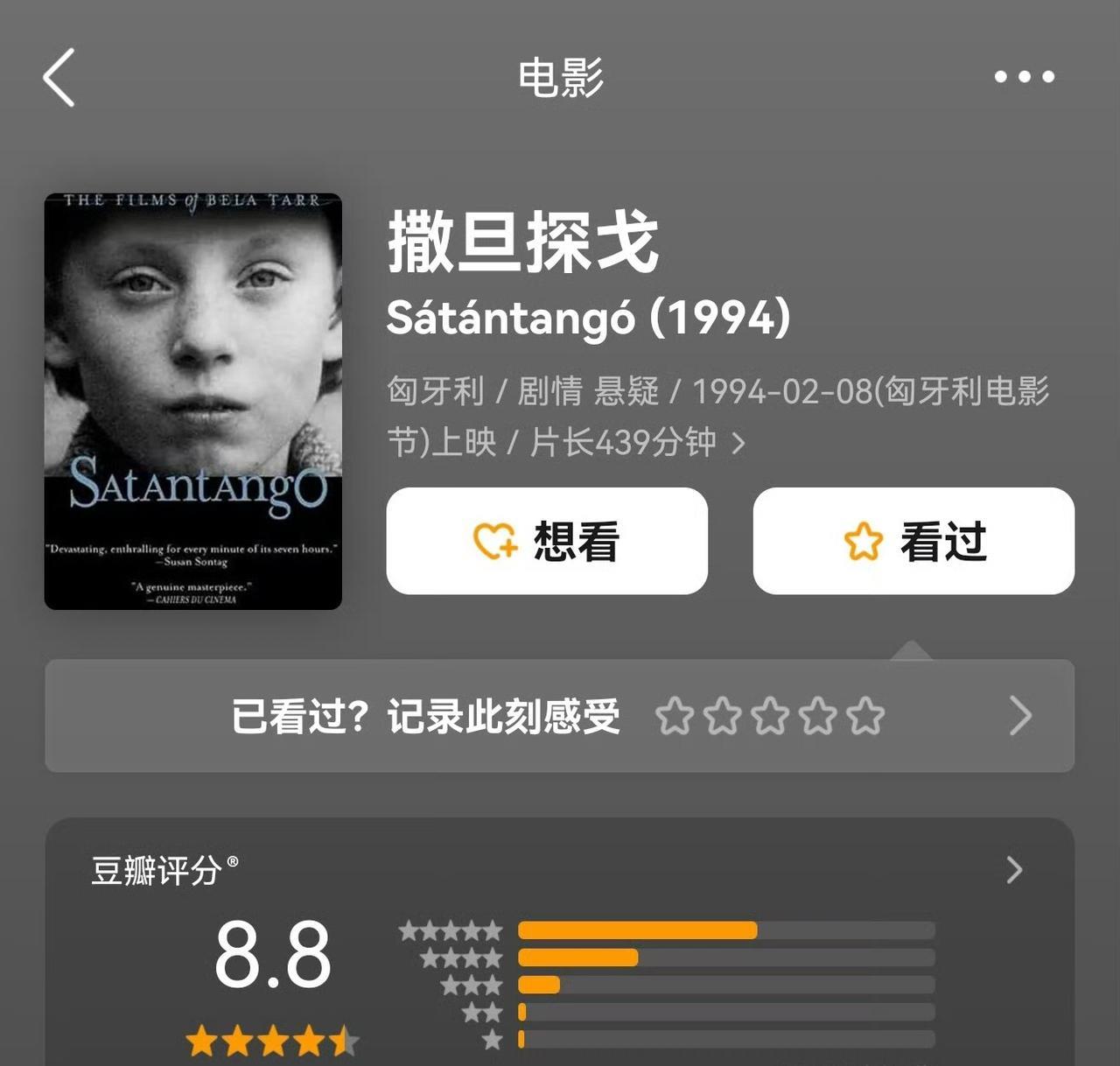 2025年诺贝尔文学奖得主,匈牙利作家克拉斯诺霍尔卡伊·拉斯洛,有一部作品被拍成电影,长达439分钟,明显和观众过不去。 这就是他最有名的作品《撒旦探戈》,看这个电影实在需要下一个非常大的决心,片长439分钟,太费劲了,苏珊·桑塔格说:“片长七小时却每一分钟皆雷霆万钧,引人入胜。但愿在我有生之年,年年都重看一遍。”好多影评人也都给这部电影极高的评价,说7个小时的电影,1分钟都不想错过。 他们说的是真话吗?他们真看过这部电影吗?就像我怀疑很多人能不能把原著读下去,毕竟这位作家以长句子出名,动不动一句话就长达好几页。