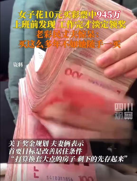 “这就是命啊!”2025年4月,重庆,一女子随手机选了张双色球彩票,竟然斩获945万元大奖,惊呆了从未中过大奖的老彩民丈夫,女子丈夫直呼,十年钻研都不如她随手一选!网友:中不中都看命啊! 中彩票头奖的概率实在太小了,多少老彩民兢兢业业研究彩票号码,十几年期期不落购彩,仍然摸不到奖金,可有些人随手一买就能直接拿走几百万钞票,你说气不气人! 一名女子路过福彩店随手机选了5注号码,她没期望自己能中奖,就是抱着买着玩玩的心态,第二天上班前女子在手机上看到了当期的中奖号码,她有些不可置信,拿出自己的彩票核对多遍,才确认自己中了双色球一等奖。 这可把女子的丈夫惊呆了,要知道,女子丈夫是位老彩民,这么多年来他绞尽脑汁研究彩票号码规律,几乎期期都买,最高只中过三等奖,女子丈夫直呼,这么多年的努力都不如老婆随手一买! 得知自己中奖后,女子并没有立刻去领奖,她手头还有不少工作没完成,一直到下午忙完才请假,在丈夫的陪同下来到当地福彩中心兑奖,全程还十分淡定。 这份巨额奖金夫妻俩打算用来改善生活,现在他们居住的房屋平方不大,两人计划先换一个大点的房子,剩下的钱存起来,以后再慢慢规划怎么用。 不少网友称女子是“锦鲤”,彩票就是生活的调味剂,等待开奖的时间里全是彩民对美好生活的期待,不过还是要理性购彩,量力而行! 信息来源:《太淡定了!女子花10元买彩票中945万!上完班才领奖,准备...》今日女报